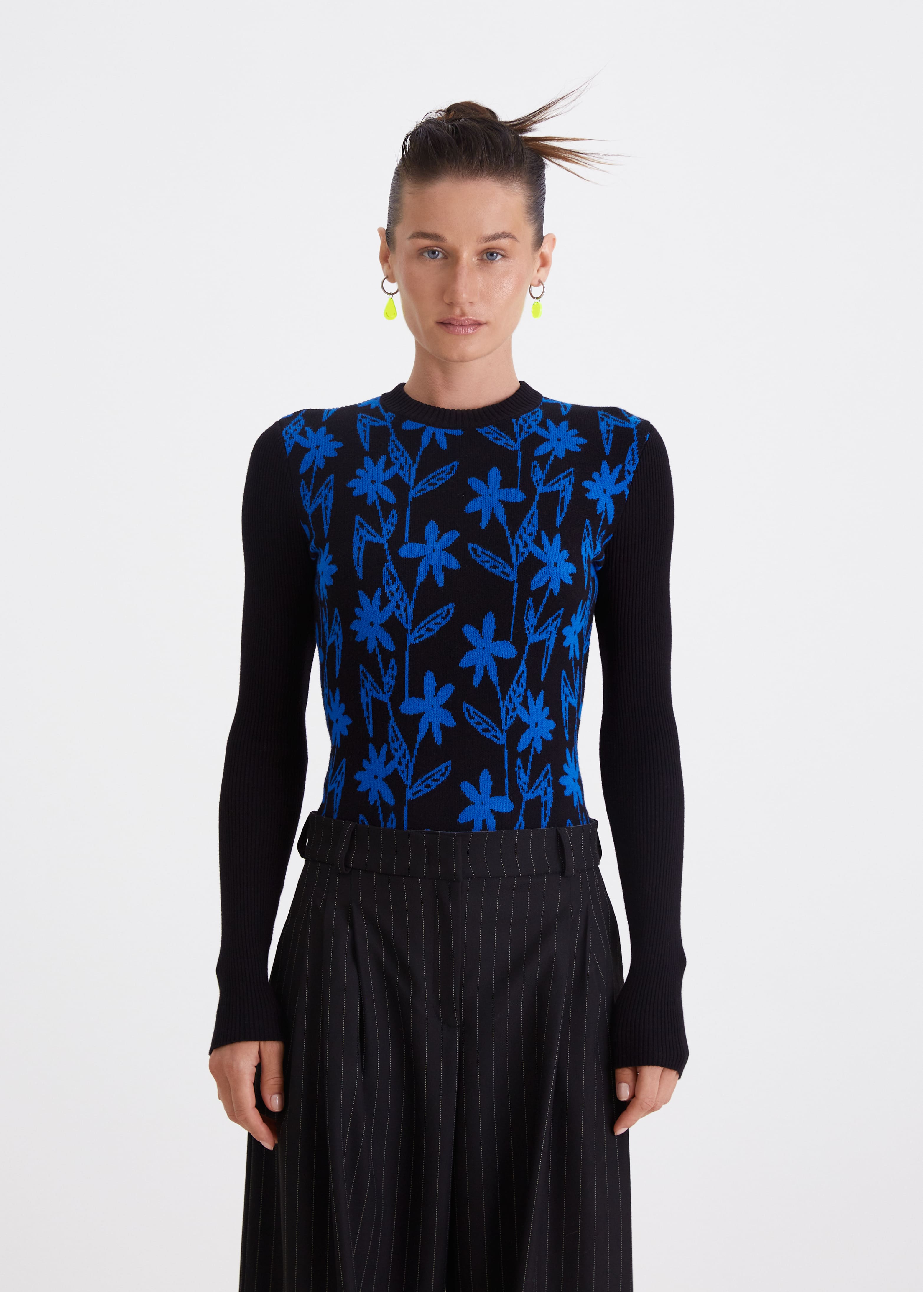 Боди черно-синего цвета из вязаного трикотажа. Приталенная модель с хорошим растяжением и фирменным цветочным принтом. Рост модели - 175 см. Уход за изделием: Деликатный режим стирки до 30 градусов или бережная ручная стирка. Сушить расправив ткань в горизонтальном положении.