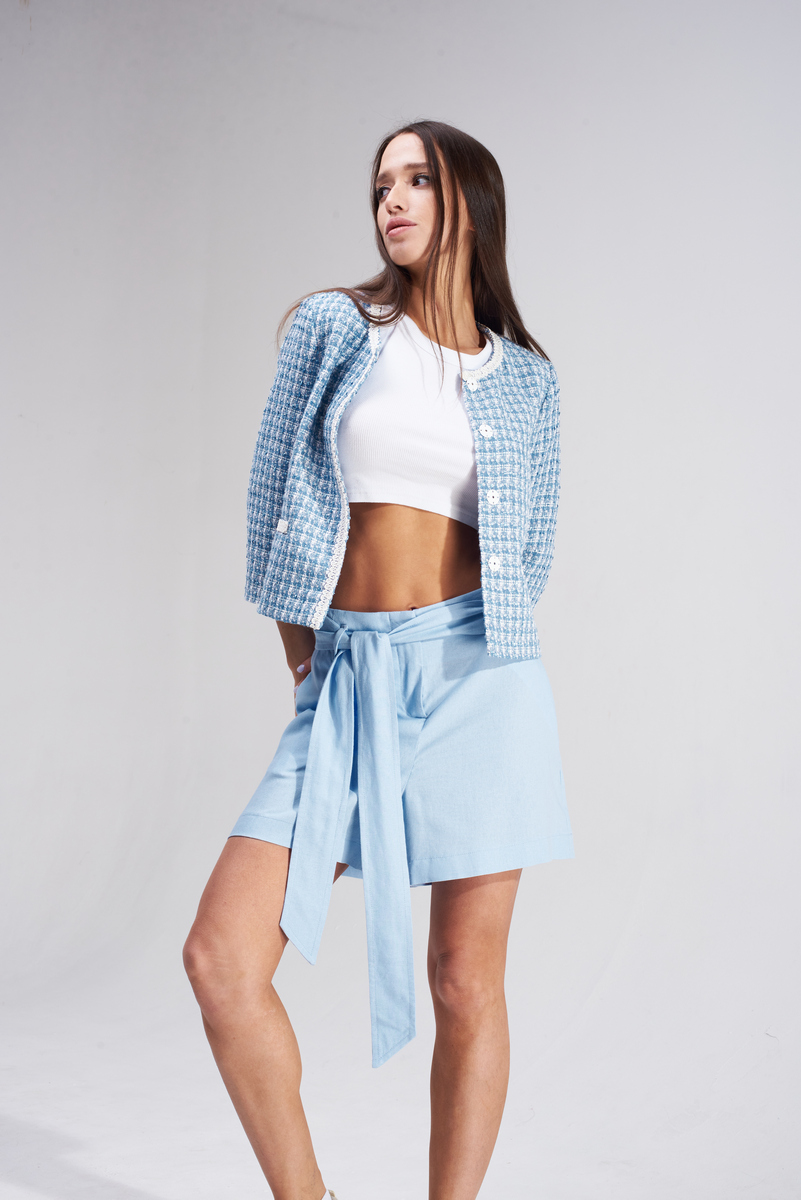 Шорты на высокой талии с карманами и вшитым поясом выполнены из льна ярко-голубого цвета c добавлением вискозы. Эта модель с широким мягким поясом станет стильной спутницей вашего летнего выхода, дополняя топ, блузу или рубашку. А завязав пояс определенным образом - в бант или узлом, задавайте стиль вашему образу: спорт-шик или просто спорт.