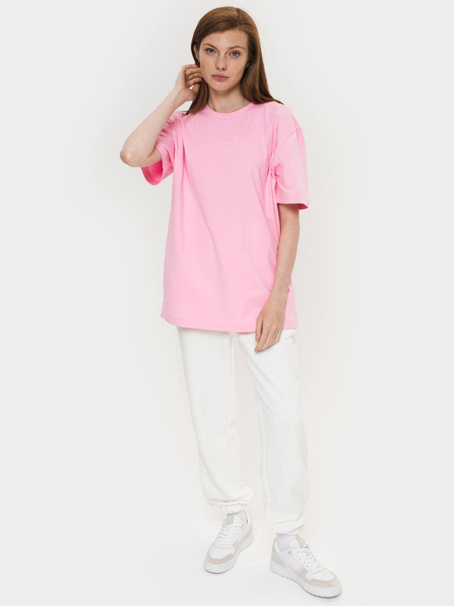 Футболка оверсайз розовая женская сшита из плотной хлопковой ткани. Футболка женская оверсайз может быть самостоятельным предметом вашего гардероба или компоноваться с брюками палаццо. Такой костюм подарит свободу движений и придаст силуэту стройность.
