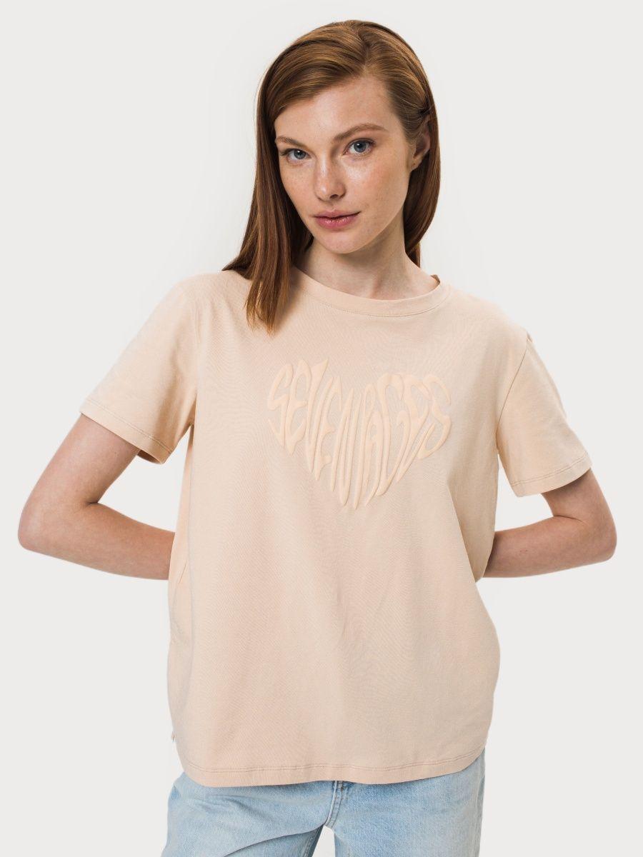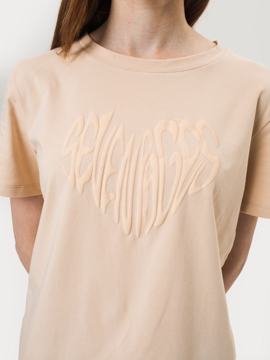 Футболка бежевого цвета с принтом в виде сердца.