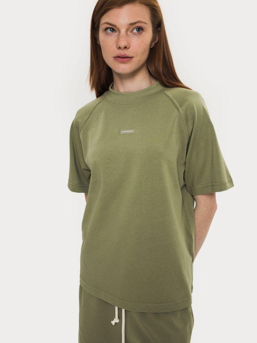 Футболка реглан оливковая из плотной хлопчатобумажной ткани.