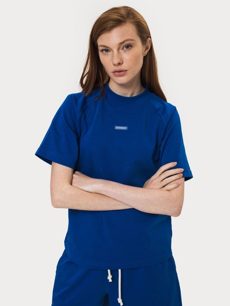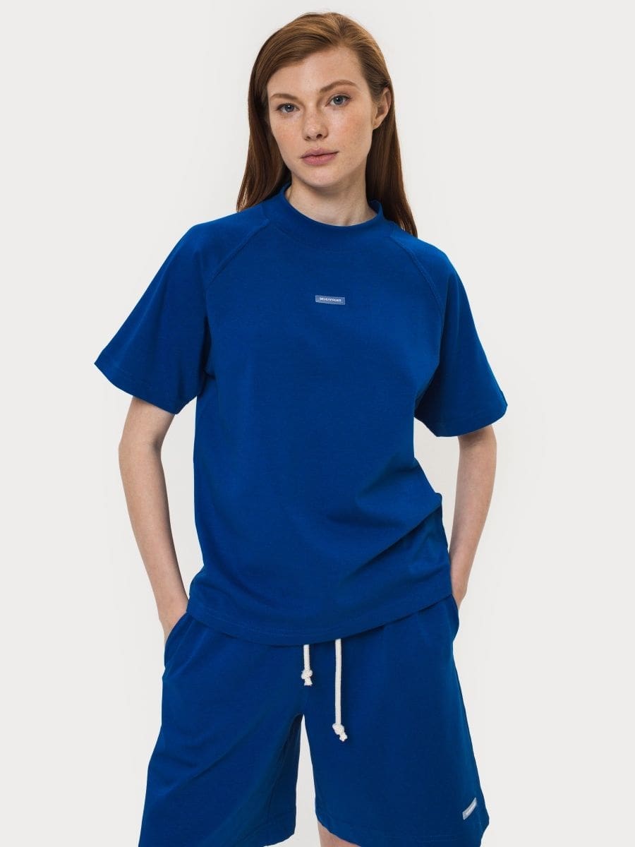 Футболка реглан синяя из плотной хлопчатобумажной ткани.