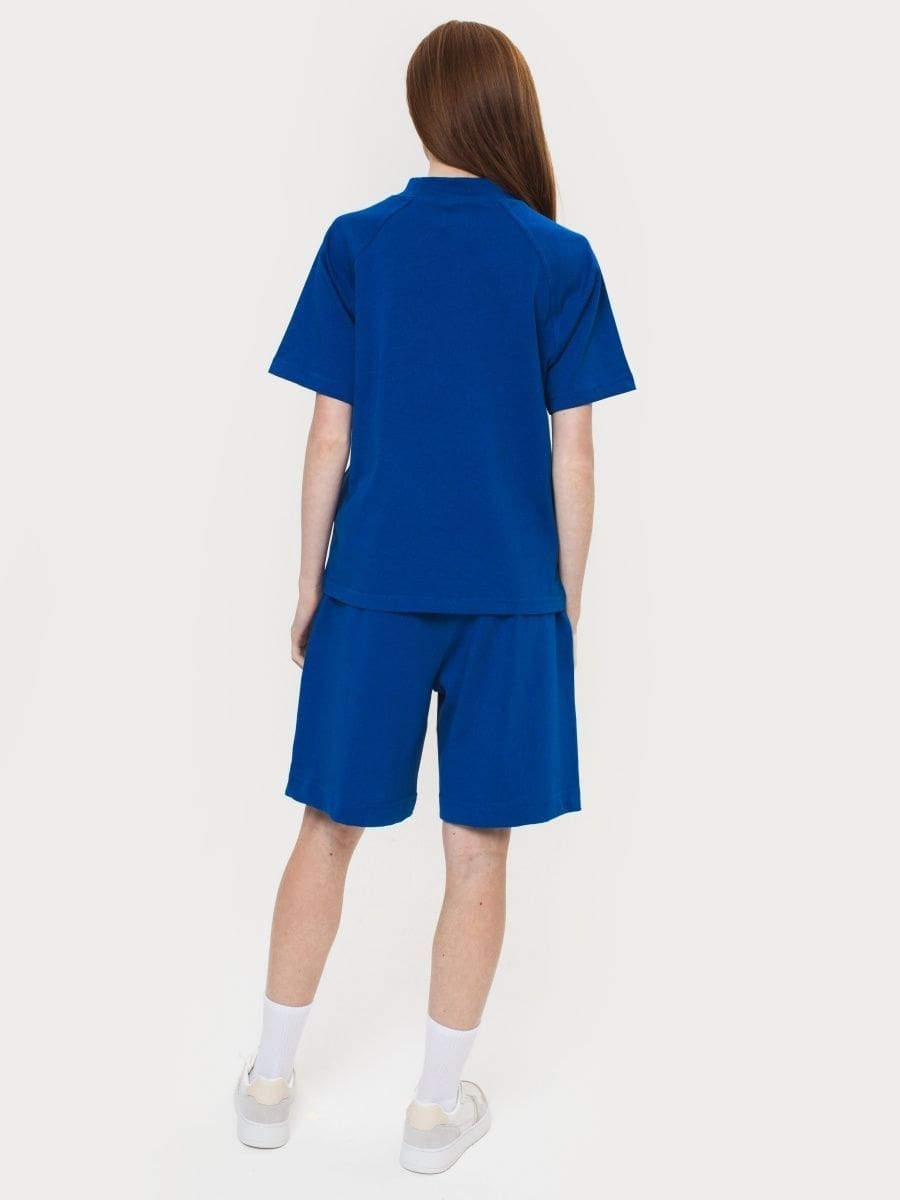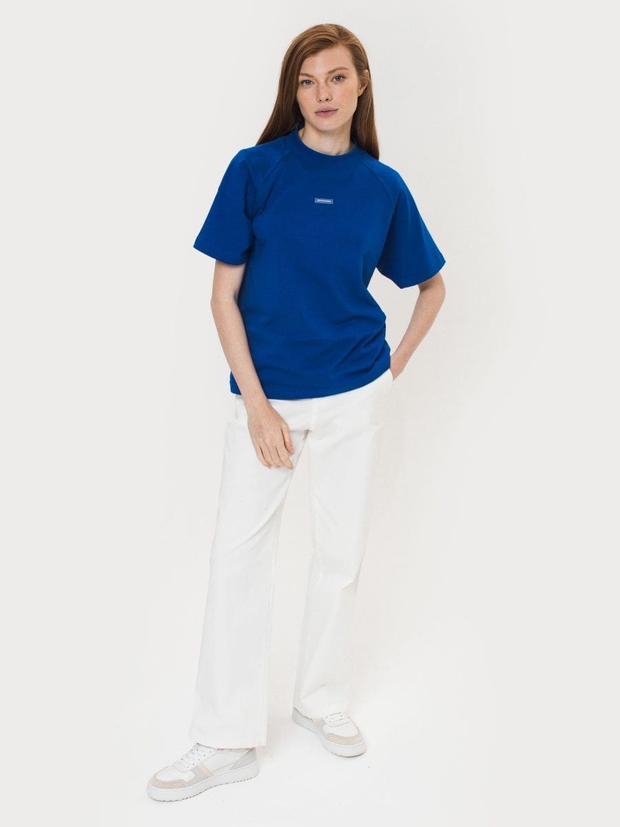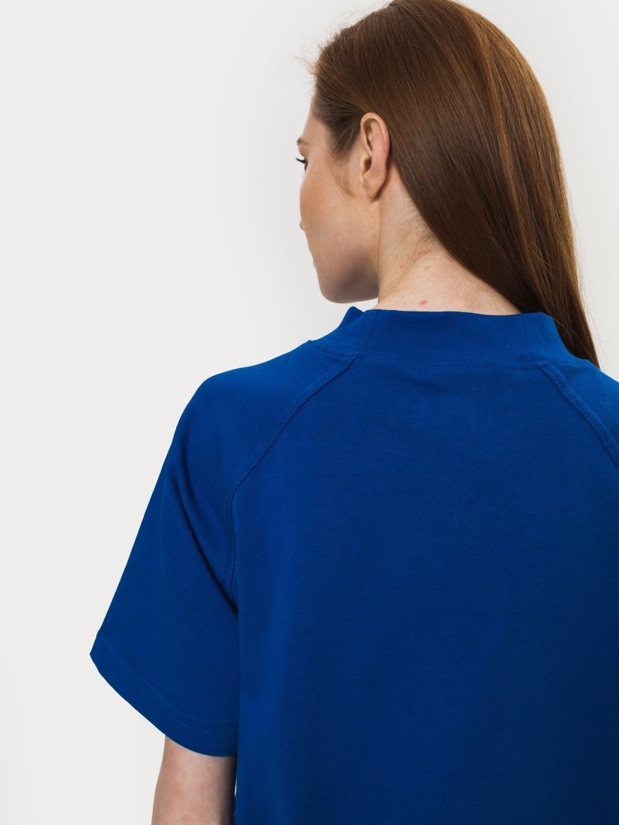 Футболка реглан синяя из плотной хлопчатобумажной ткани.