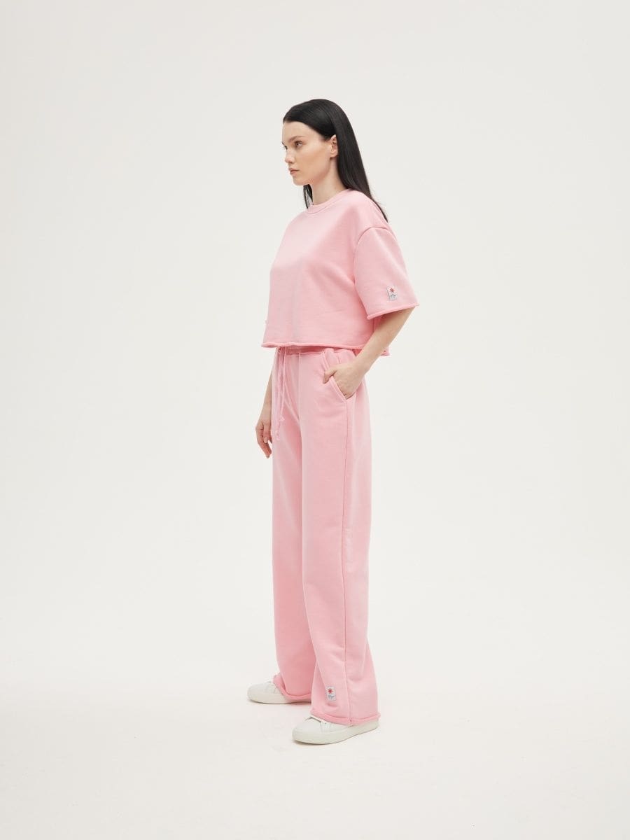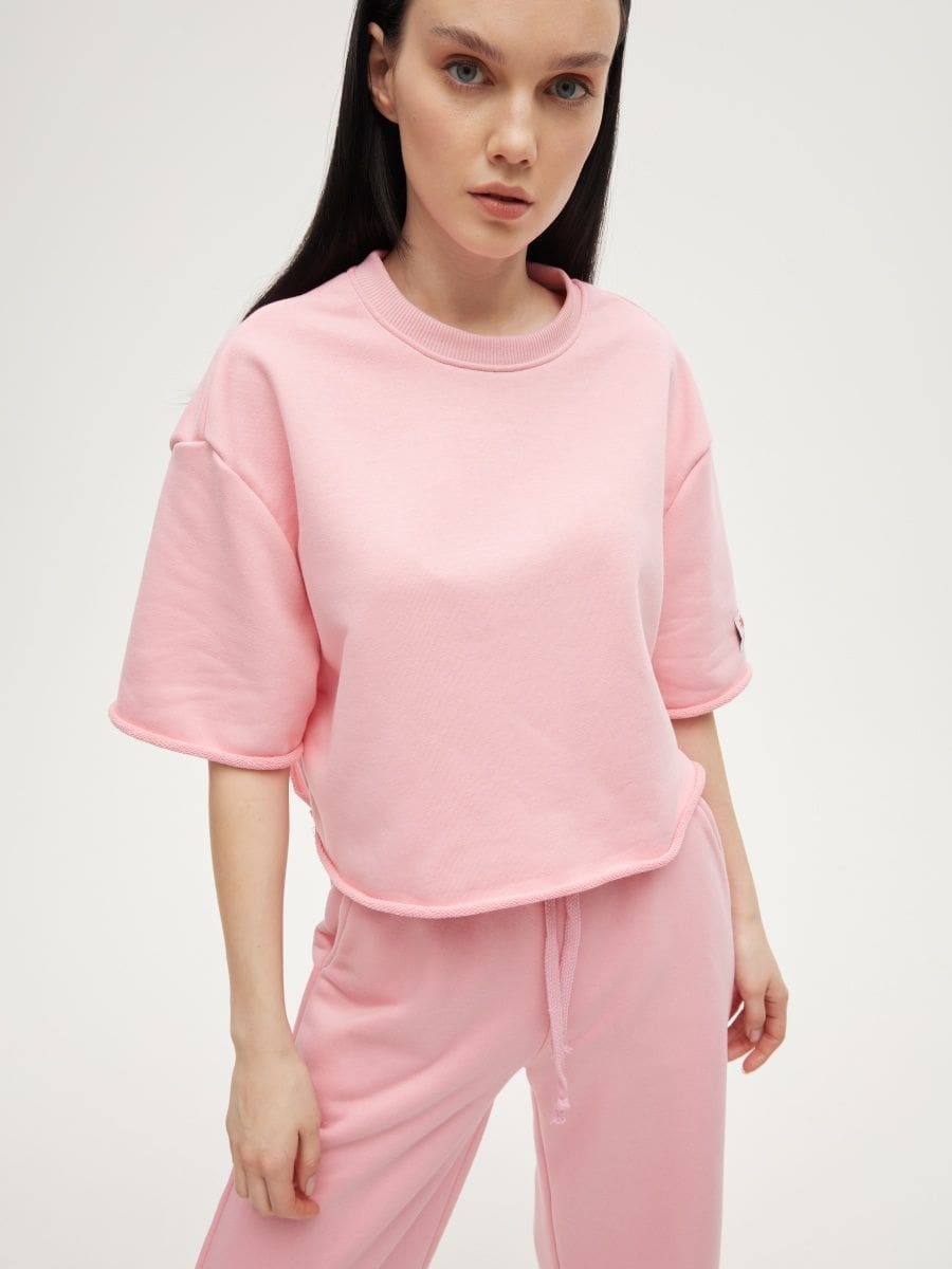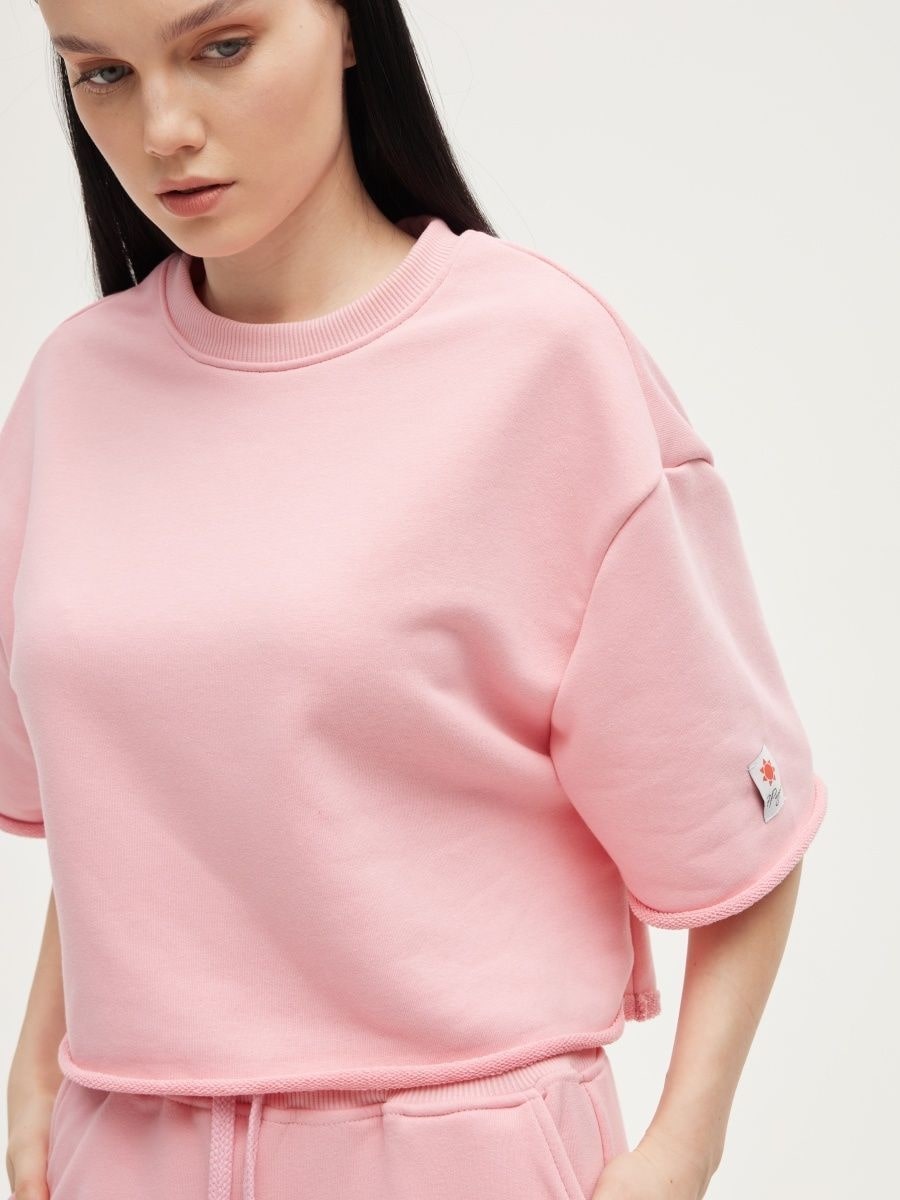 Футболка топ розовая выполнена из плотной ткани. Укороченная футболка имеет необработанный край по низу изделия и рукава.