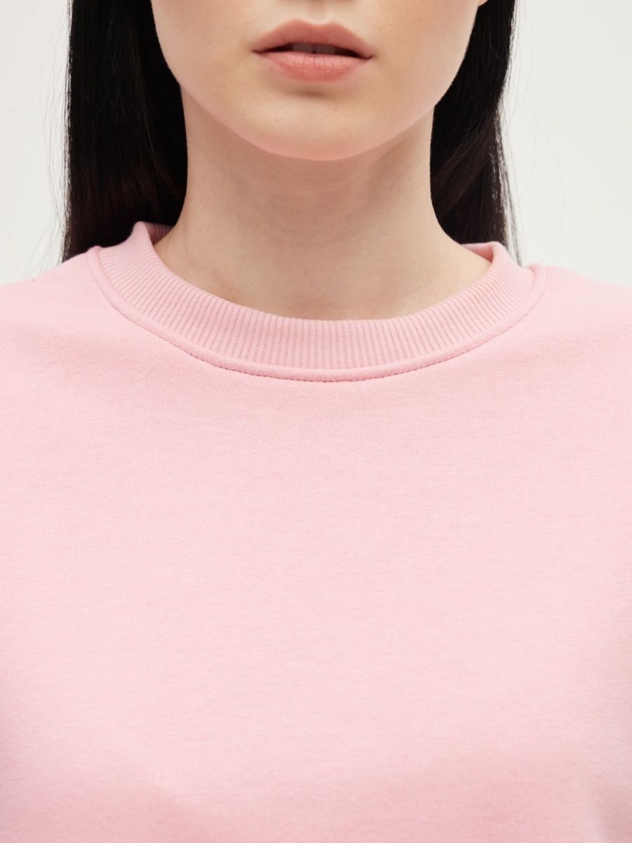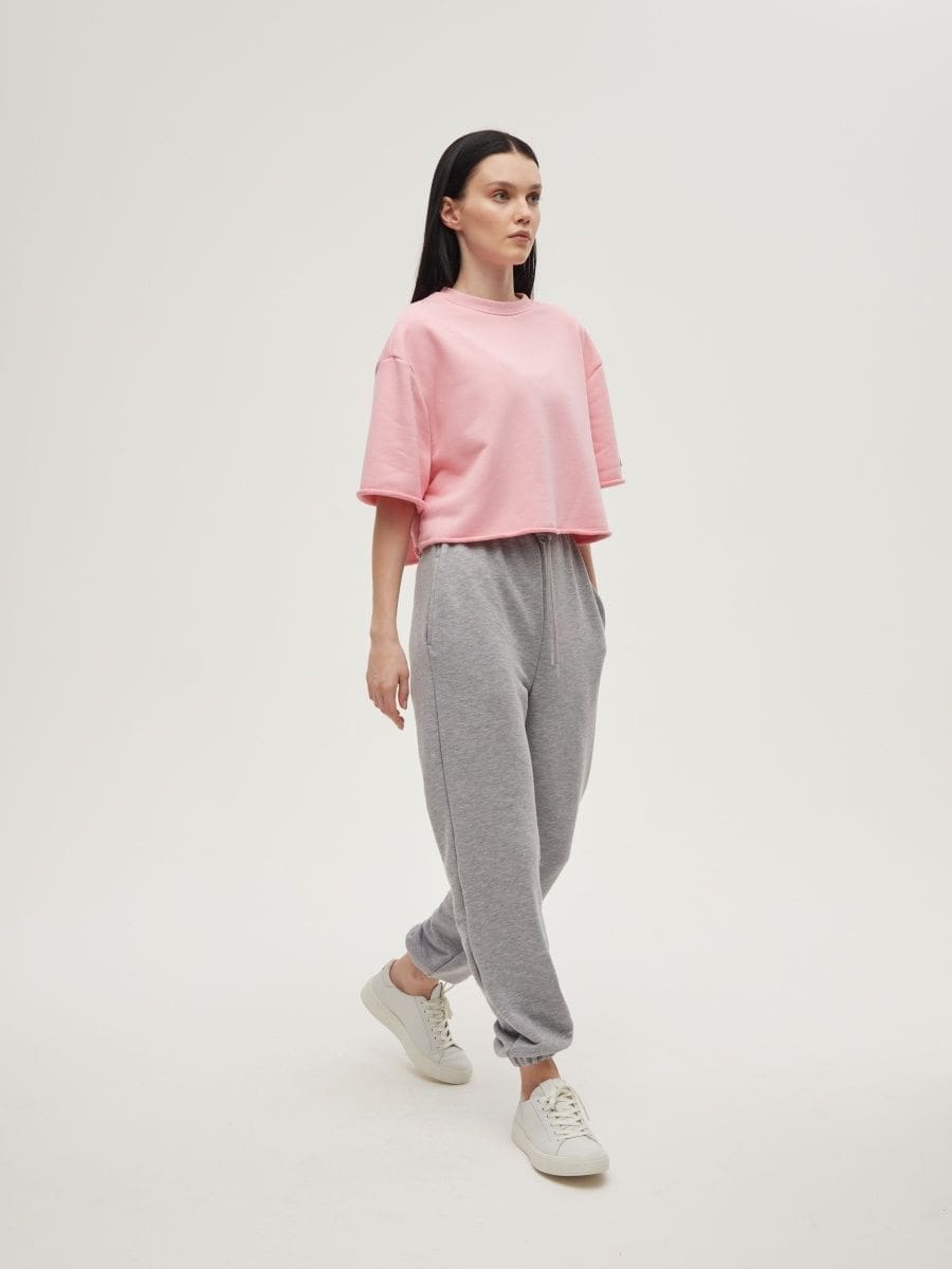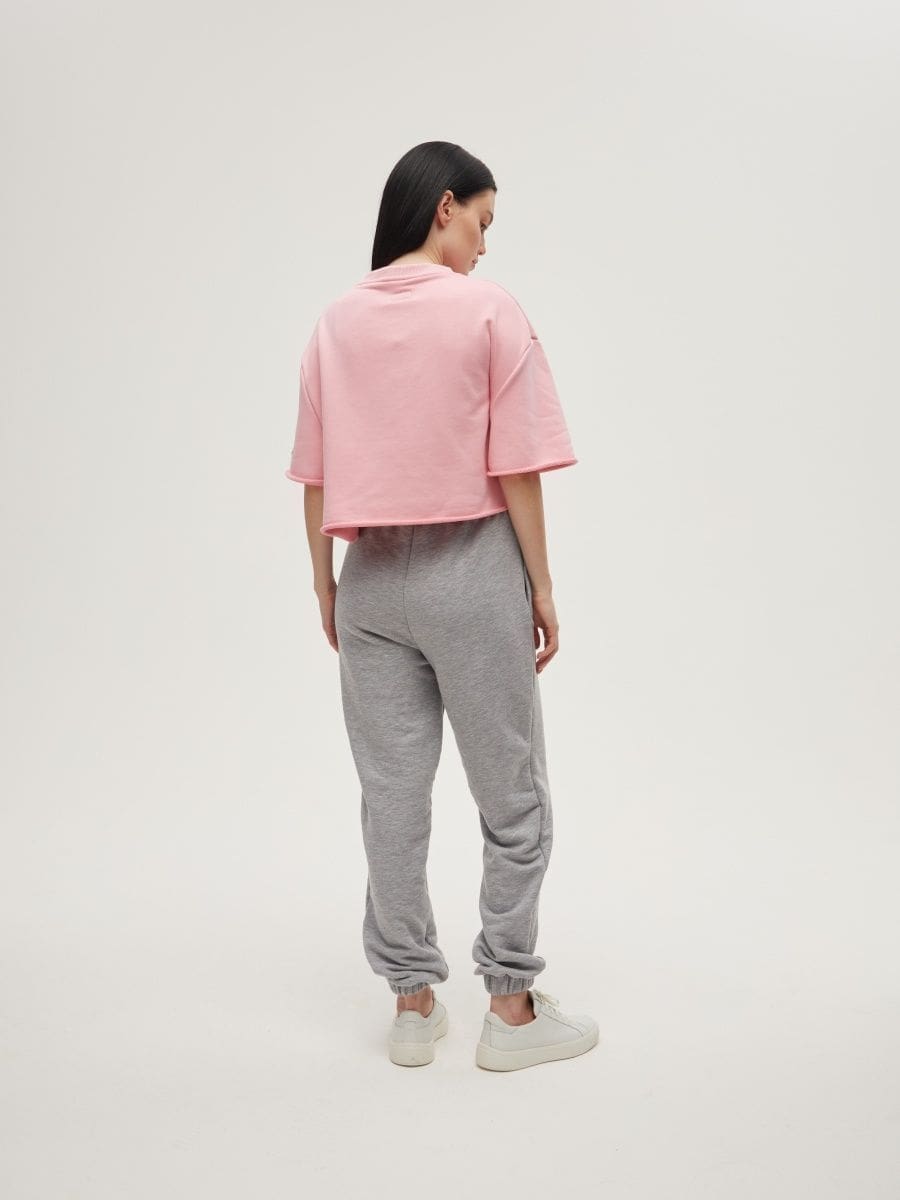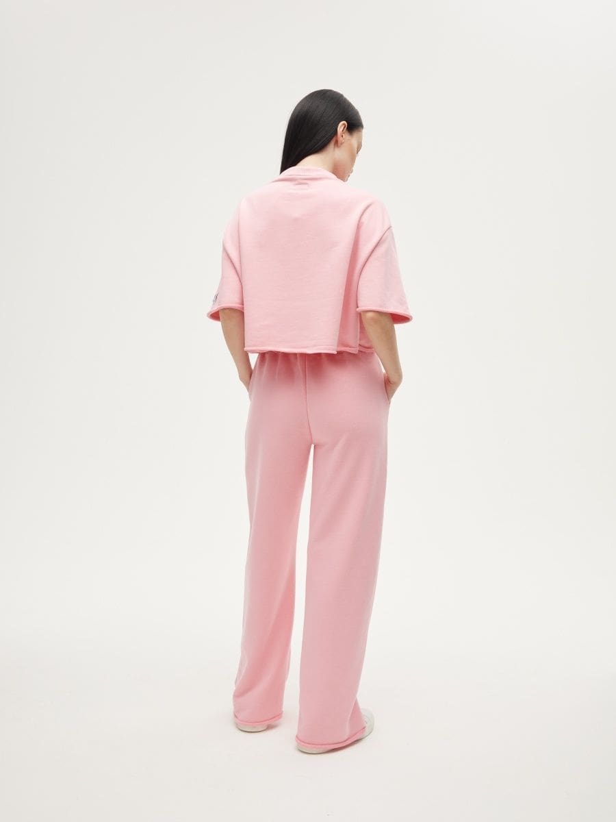 Футболка топ розовая выполнена из плотной ткани. Укороченная футболка имеет необработанный край по низу изделия и рукава.