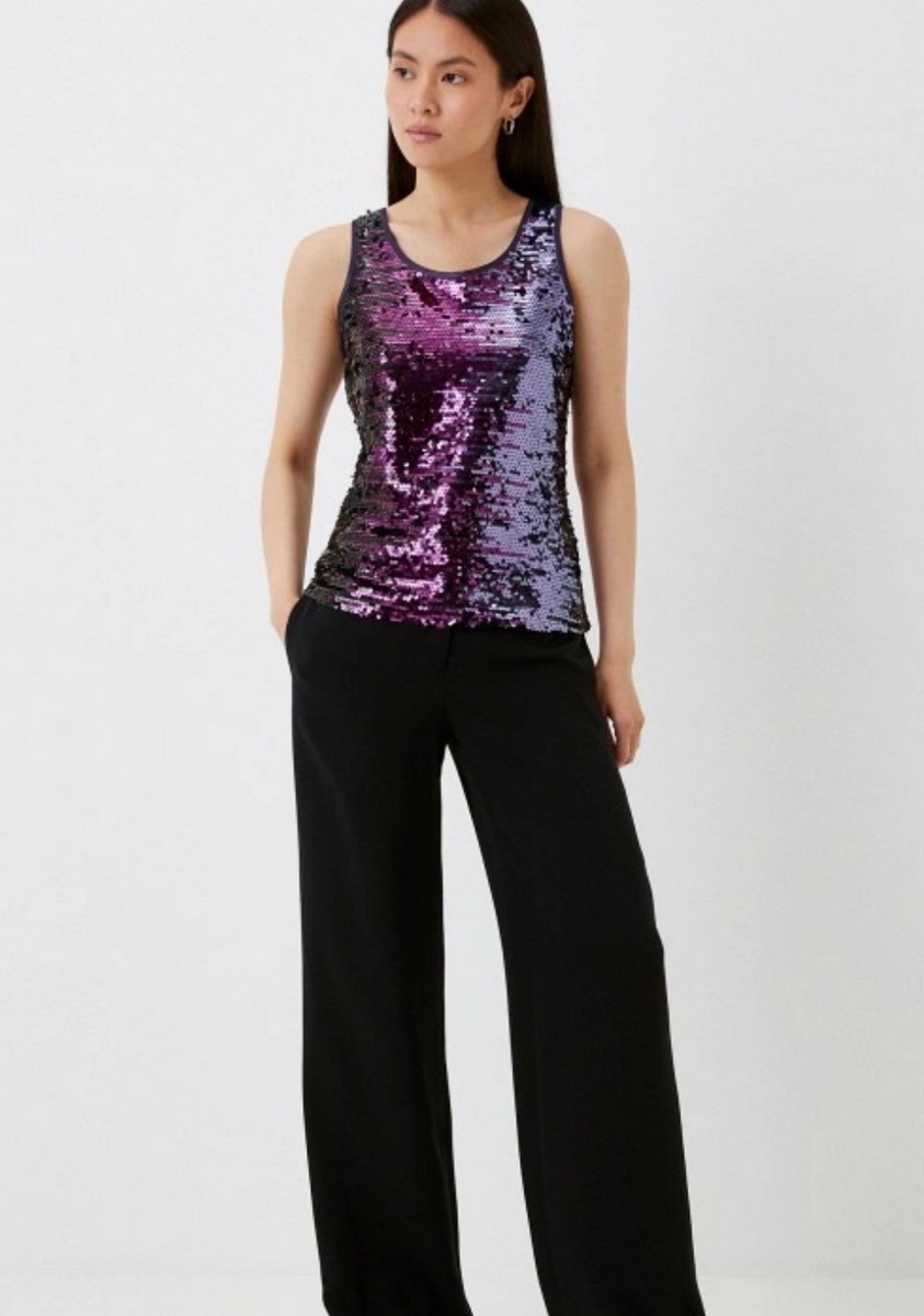 Топ, стилизованный под майку, полностью расшит сверкающими пайетками-несомненно тренд этого сезона. Этот блестящий коктейльный вариант в оттенках от нежно-сиреневого до фиолетового станет отличным дополнением к юбке-макси или на контрасте - джинсам или черным брюкам. Блестящий эффектный выбор для вашего запоминающегося выхода!