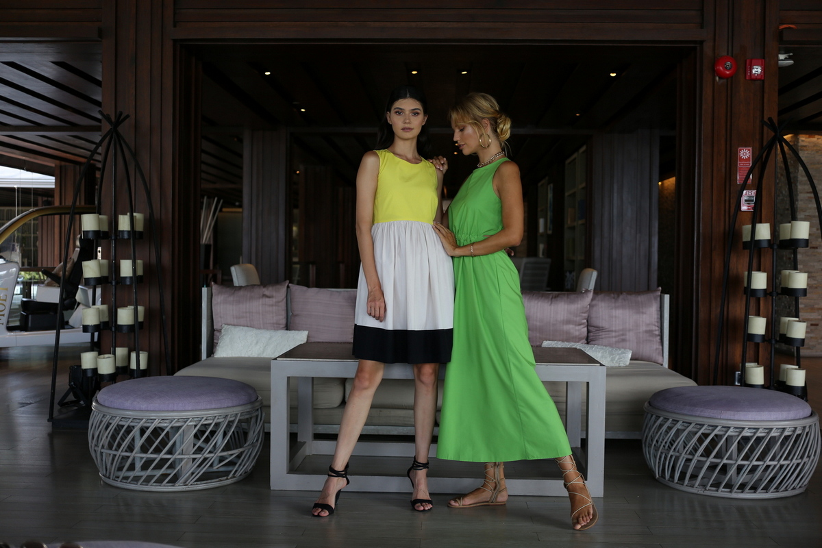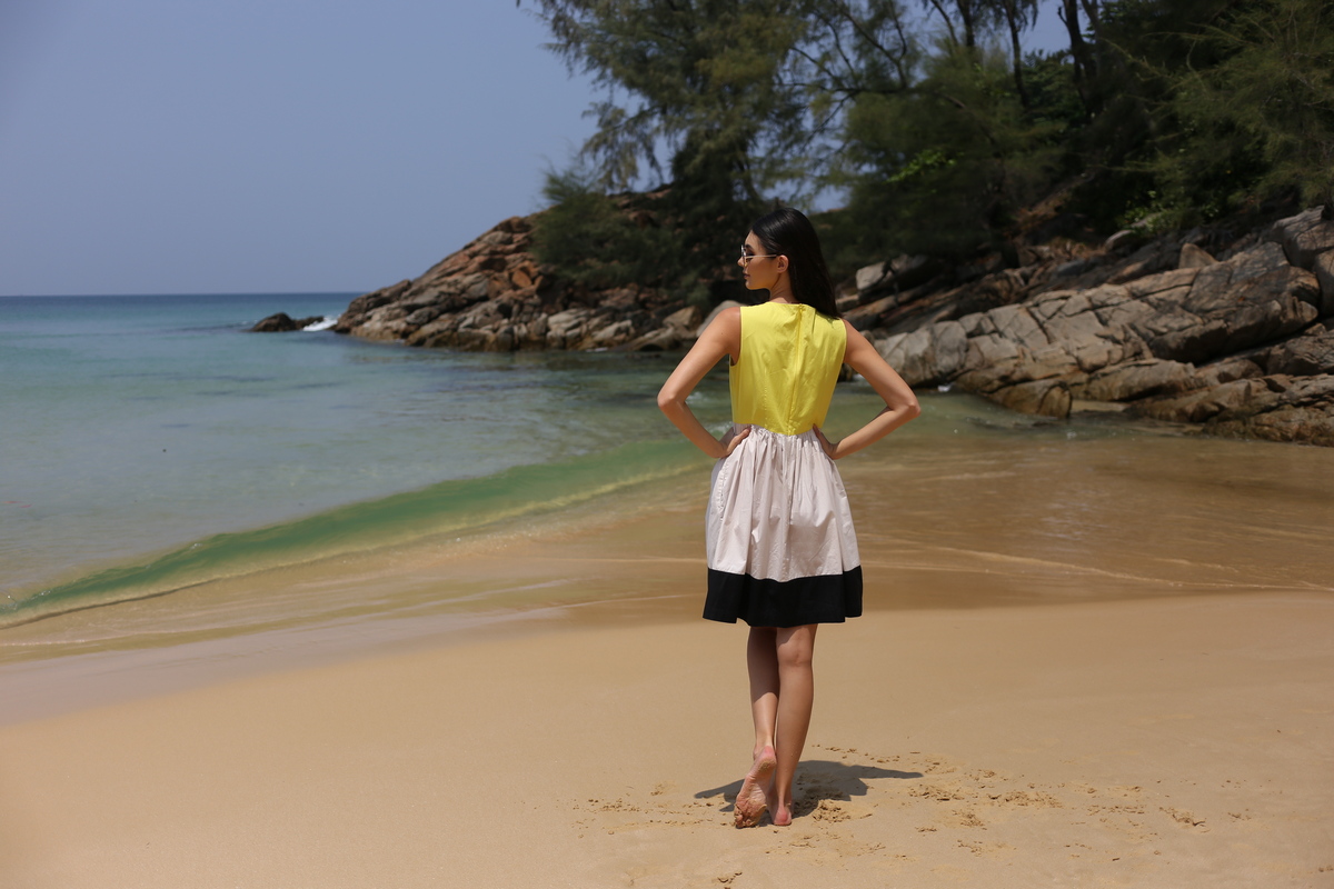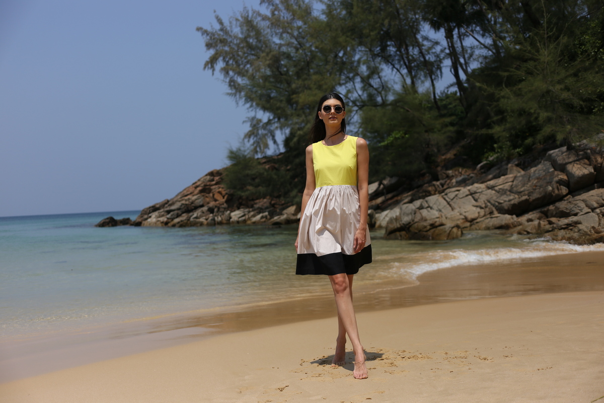 Платье с отрезной талией без рукавов выполнено из итальянского поплина трех цветов с расклешенной объемной юбкой. Лиф желтого цвета соединяется с двухярусной сосборенной юбкой; ярусы в двух цветах- светло-бежевый и черный. Слегка завышенная талия создает впечатление приталенного силуэта и зрительно делает вас выше и стройнее. Незаменимое платье как на отдыхе, так и летом в городе.