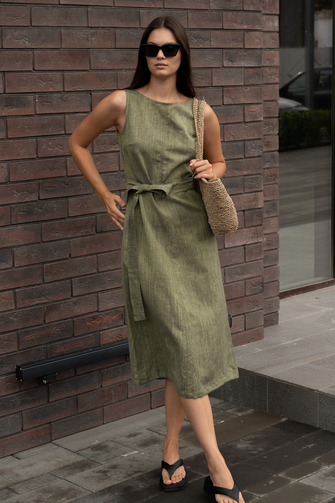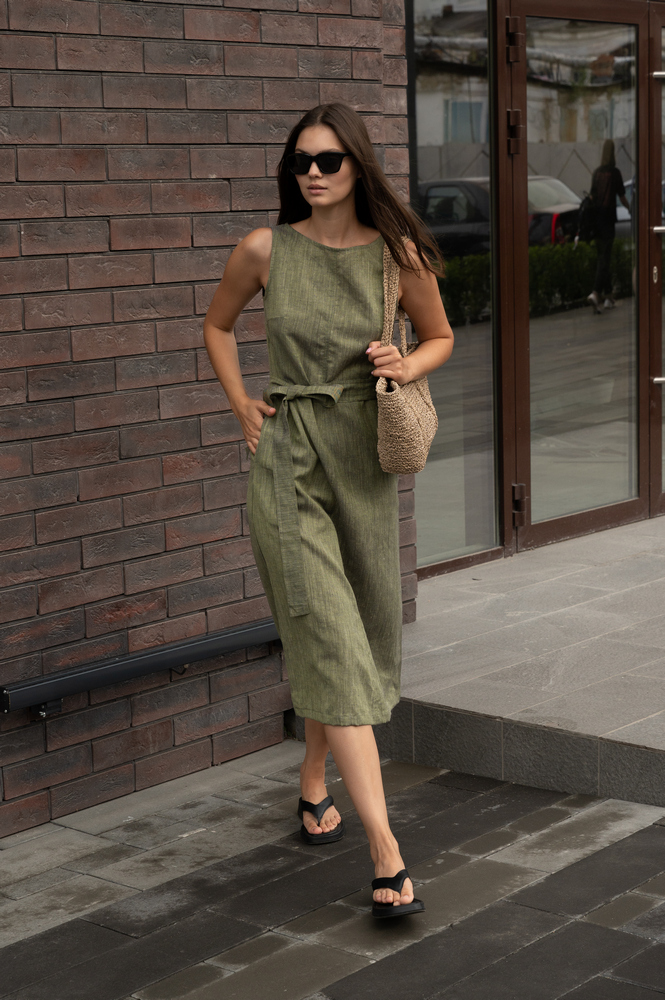 Легкий льняной сарафан в оттенке хаки с поясом, который подчеркивает талию. Миди-длина делает его подходящим для соблюдения офисного дресс-кода, а полуприлегающий силуэт позволяет сочетать как с каблуками, так и с открытой обувью на плоской подошвой.