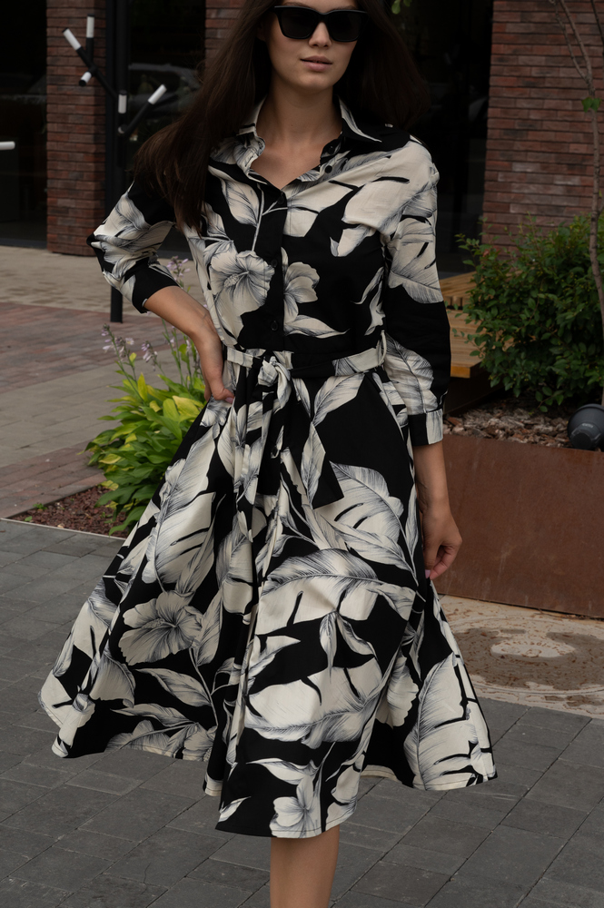 Платье-рубашка с крупным растительным принтом в черно-белом оттенке - легкий, невесомый материал позволяет носить её в жаркую погоду, а “рубашечный” верх уравновешивает летящая юбка.