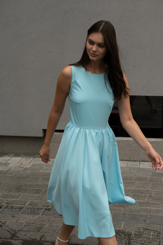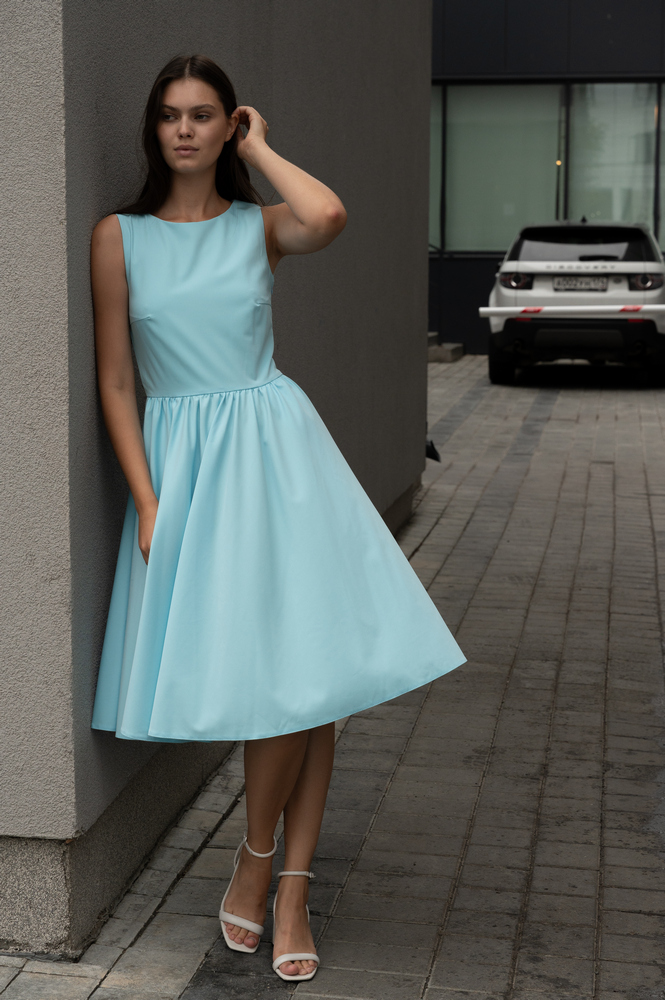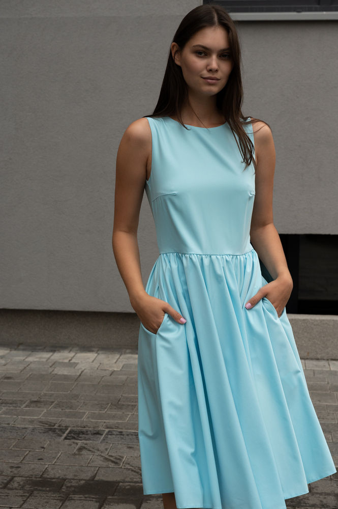 Универсальный бирюзовый сарафан — идеально подойдет тем, кто вернулся из отпуска, чтобы продлить впечатления от отдыха и продемонстрировать ровный морской загар.