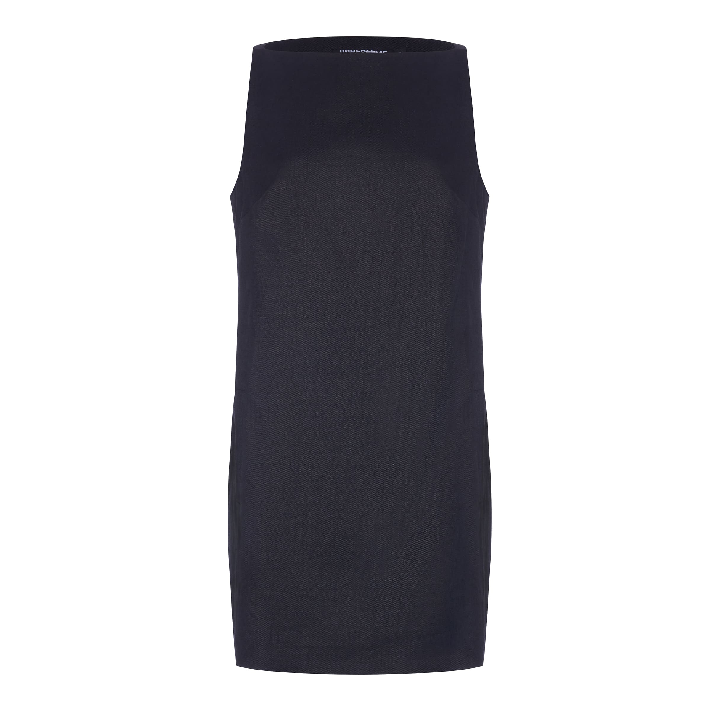 Короткое льняное платье с подкладом в черном цвете. Застежка на спине с потайной молнией, по бокам скрытые карманы.
