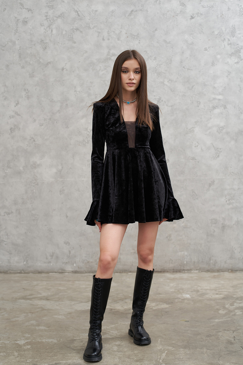 Платье с фигурным вырезом с сеткой и юбкой-солнцем, расширенная линия плеч, плечевые накладки, длина мини, потайная молния на спине, воланы на рукавах. Цвет: черный Уход: сухая чистка Рост модели на фото: 173 см Размерная сетка: XS: Плечи: 38 Грудь: 76-80 Талия: 68-72 Длина рукава: 72 Длина по спинке: 76 S: Плечи: 39 Грудь: 80-84 Талия: 72-76 Длина рукава: 72 Длина по спинке: 76 M: Плечи: 40 Грудь: 84-88 Талия: 76-80 Длина рукава: 72 Длина по спинке: 77