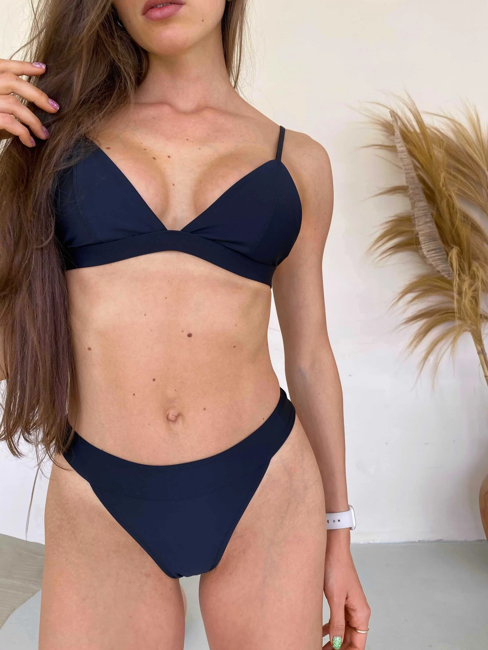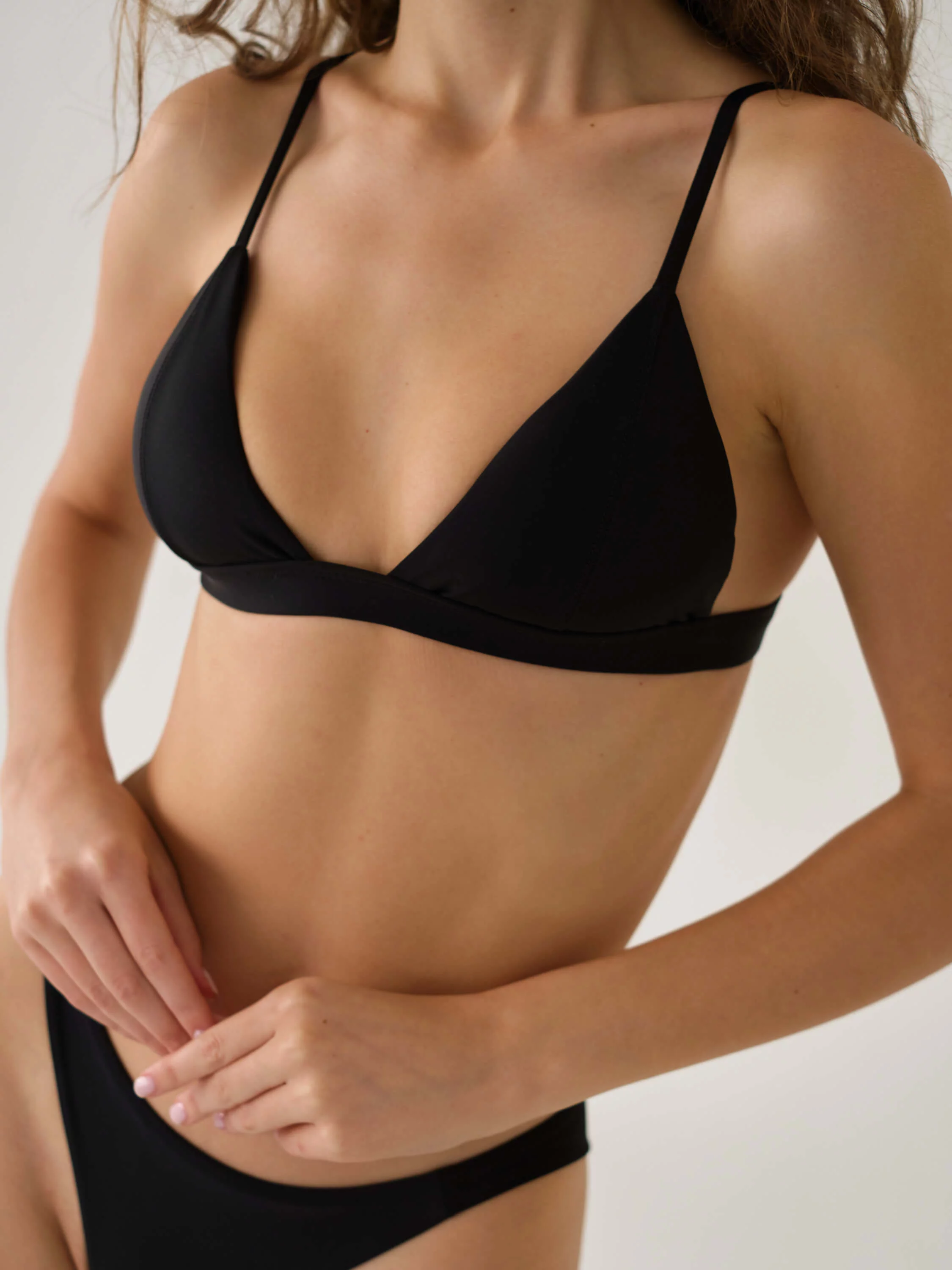 Нельзя ошибиться с классикой! Этот верх-бикини с фиксированными треугольными чашечками — стиль вне времени. Широкий пояс снизу обеспечивает дополнительную поддержку, а тонкие бретели с регулировкой через плечо и застежка сзади добавляют универсальности. С помощью съёмных поролоновых вкладышей настройте привлекательность своих изгибов.