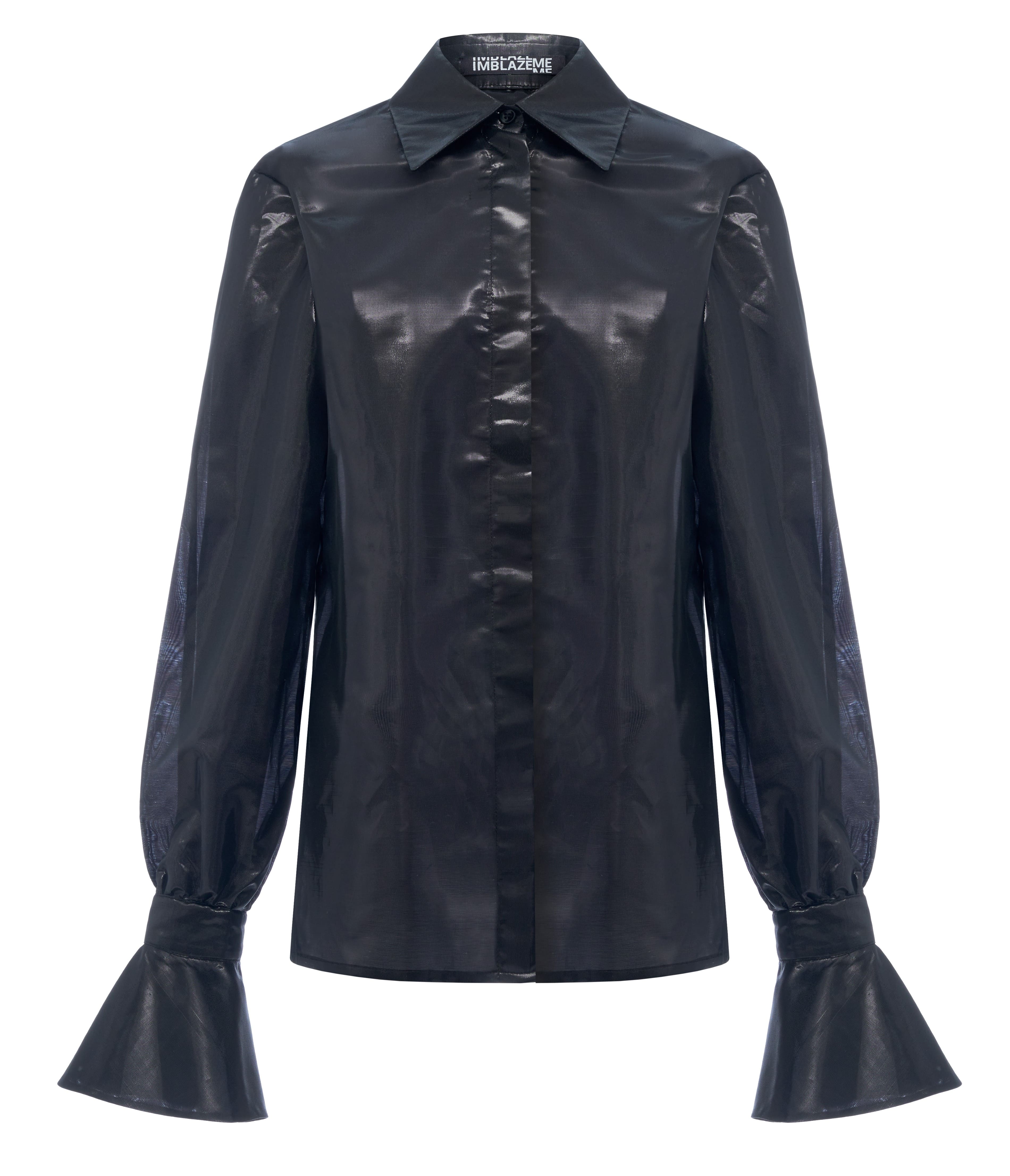 Воздушная материя, объёмные манжеты, прямой крой. Образ дополняют брюки из плотной вискозы с лёгким блеском.
