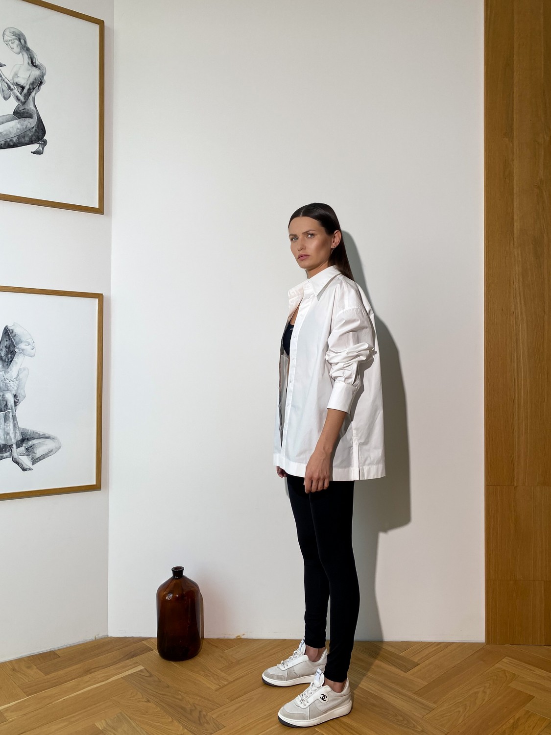Предлагаем Вам стилизовать рубашку с кожаными брюками из капсулы и пиджаком из итальянской тонкой шерсти для деловых встреч или комбинировать образ с кроп-топом и лосинами для активного отдыха с друзьями.