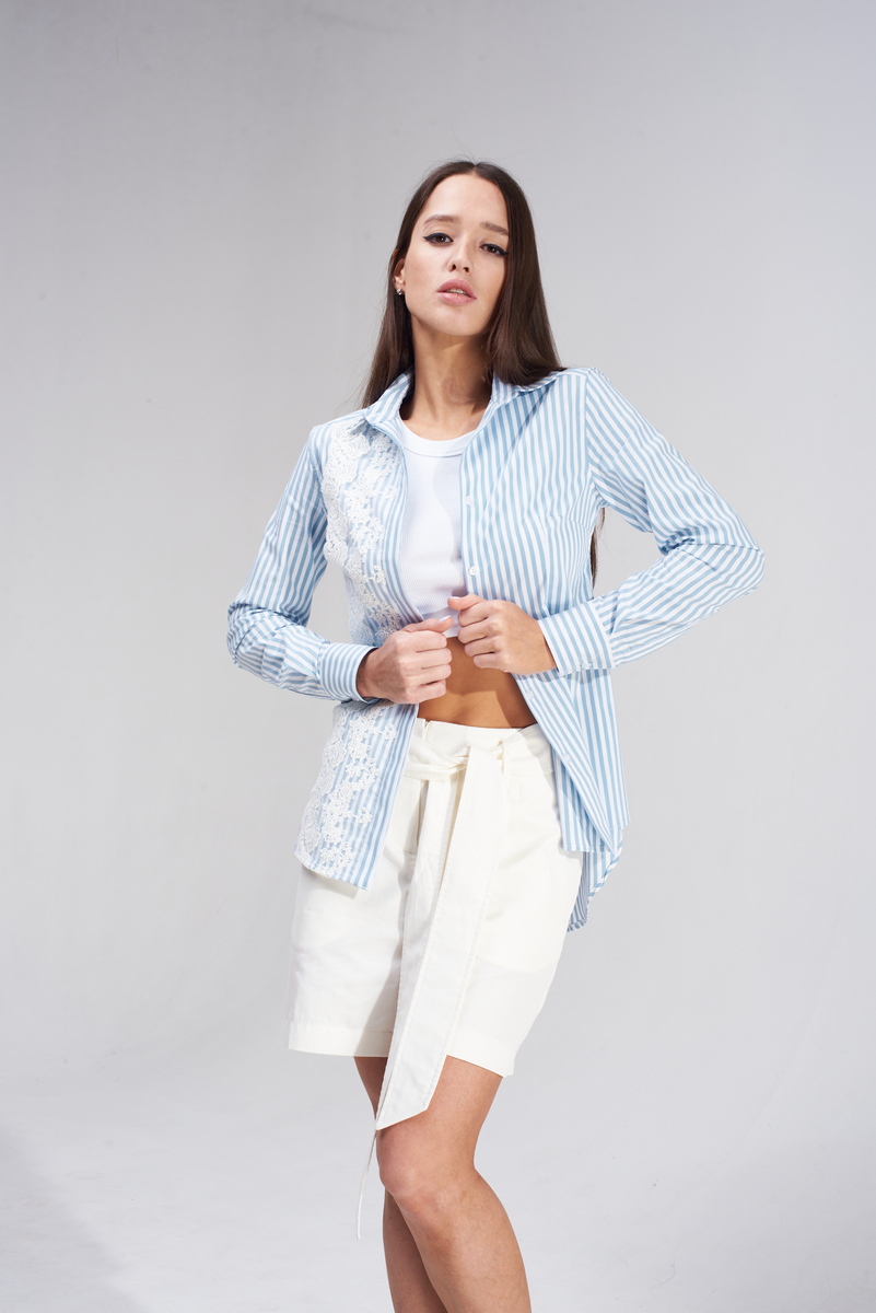 Хлопковая рубашка с узором - полоска белого и голубого цвета с синим подтоном. Ткань из коллекции Max Mara - легкая, гладкая, дышащая. Рубашка имеет приталенный силуэт, дополнительно оформлена полосой широкого французского кружева, что придает ей романтичный образ. Спинка изделия слегка удлиненная для тех, кто любит носить рубашки навыпуск.