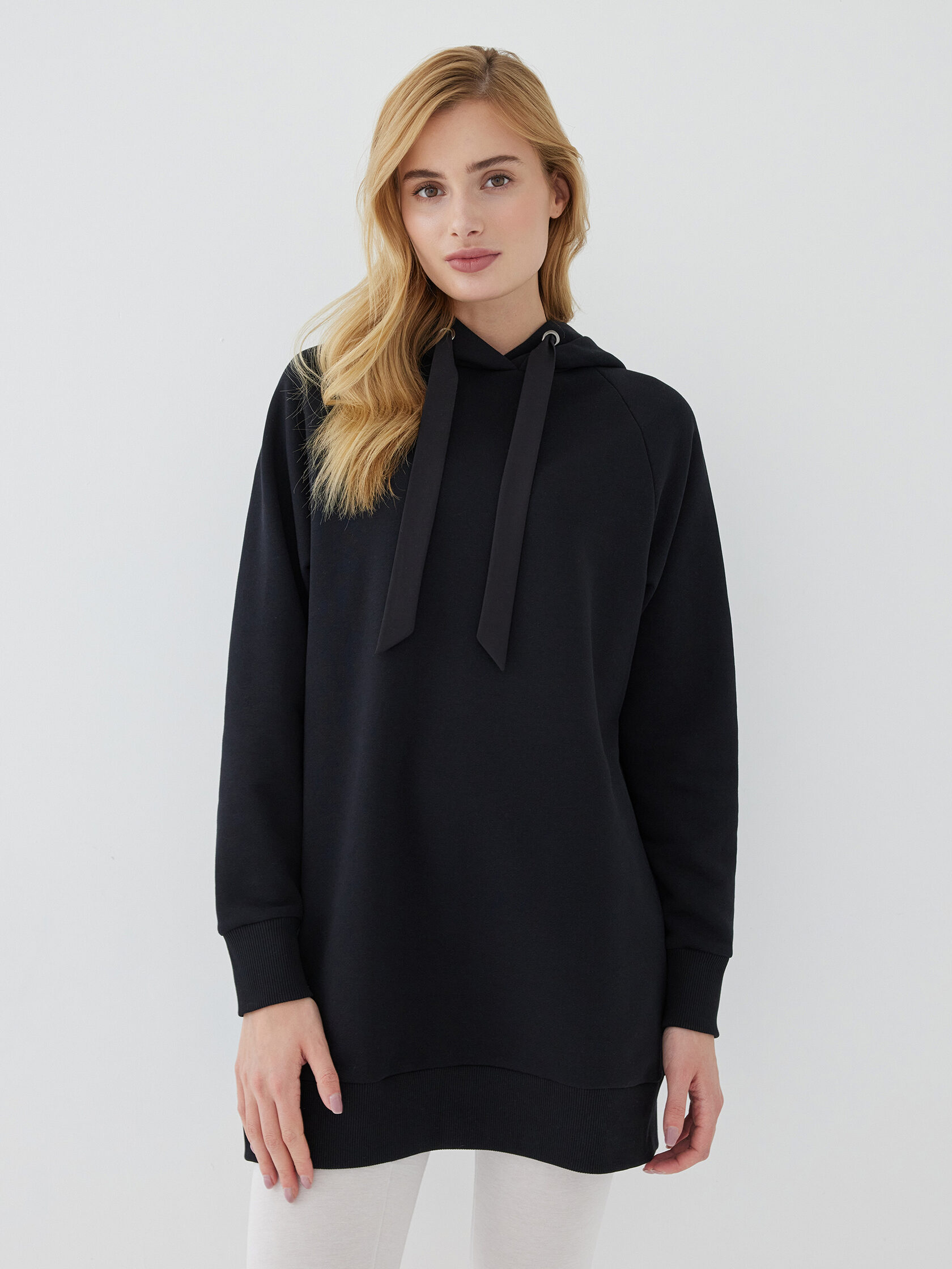 Худи-платье из приятного и качественного материала премиум класса. Мягкий, приятный и теплый. Идеально сочетается с леггинсами или плотными колготками. Глубокий черный цвет, который хорошо сочетается с белым, черным. Худи размера S/M - для девушек размера XS-S - свободная посадка (как на фото), для девушек размера M - стандартная посадка. Размер одежды модели на фото - XS(42), рост - 175 см. Длина изделия до основания шеи: 88 см ДxШxВ: 380x180x30 мм Вес: 200 г