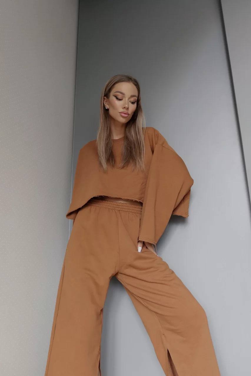 Яркий удобный костюм с необработанным краем на свитшоте и прорезями на штанах.