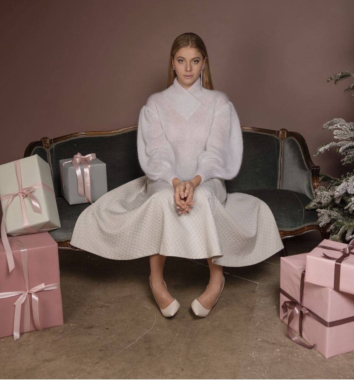 Джемпер объемного силуэта с шалевым воротом, рукавами - буфами и деликатным блеском