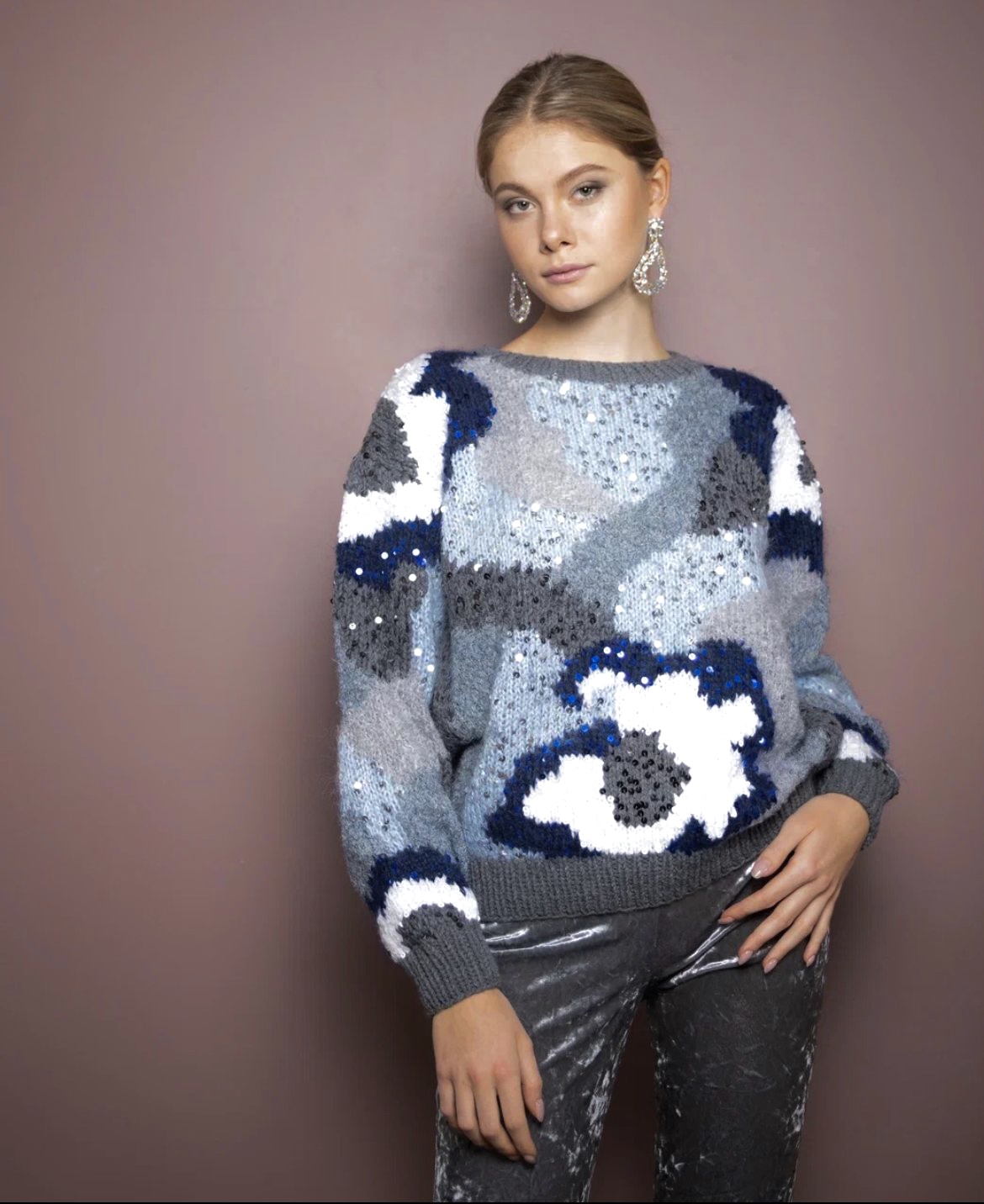 Джемпер с круглым воротом из пряжи различной фактуры с рисунком "цветы". Фрагменты принта выполнены из пряжи с пайетками.