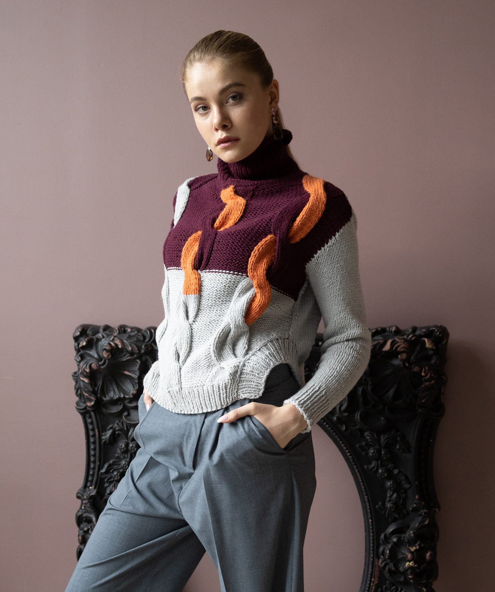 Джемпер с высоким воротом, цветным рисунком "косы" и вырезами по бокам