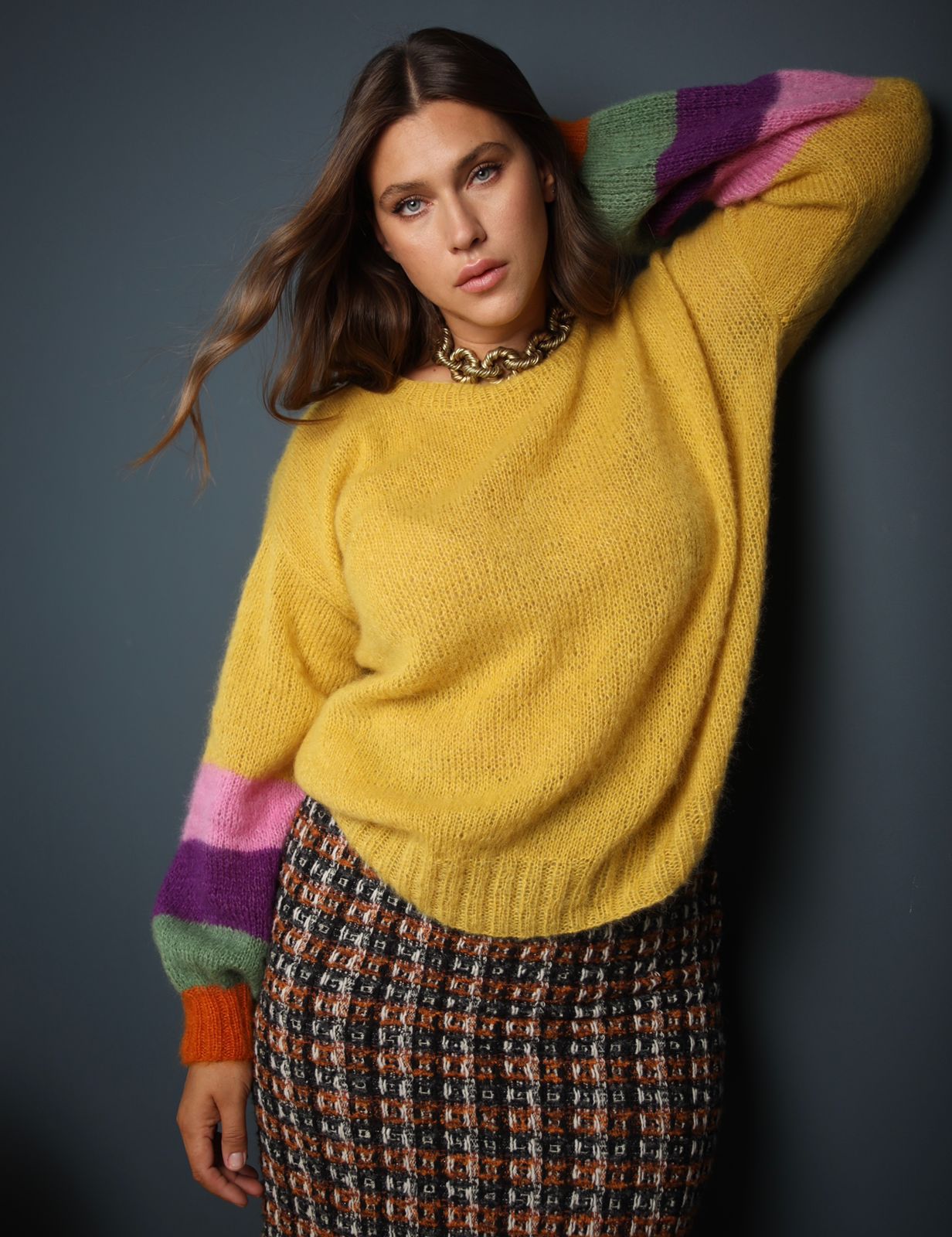 Джемпер силуэта oversize. С объемными рукавами. На рукавах яркие полосы.