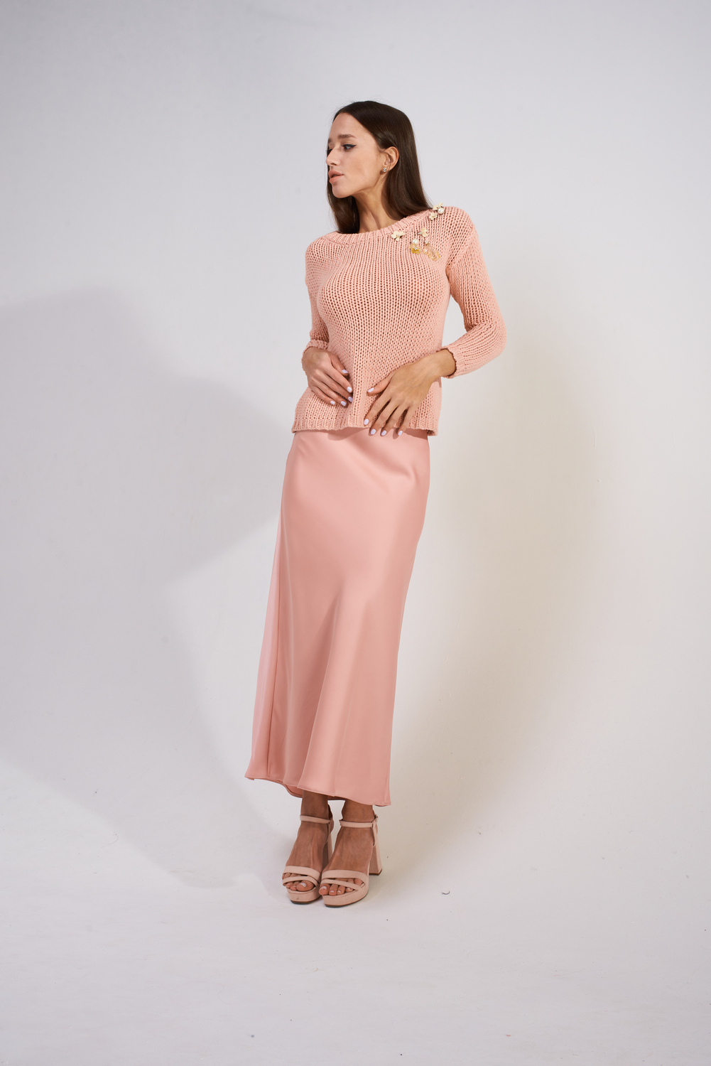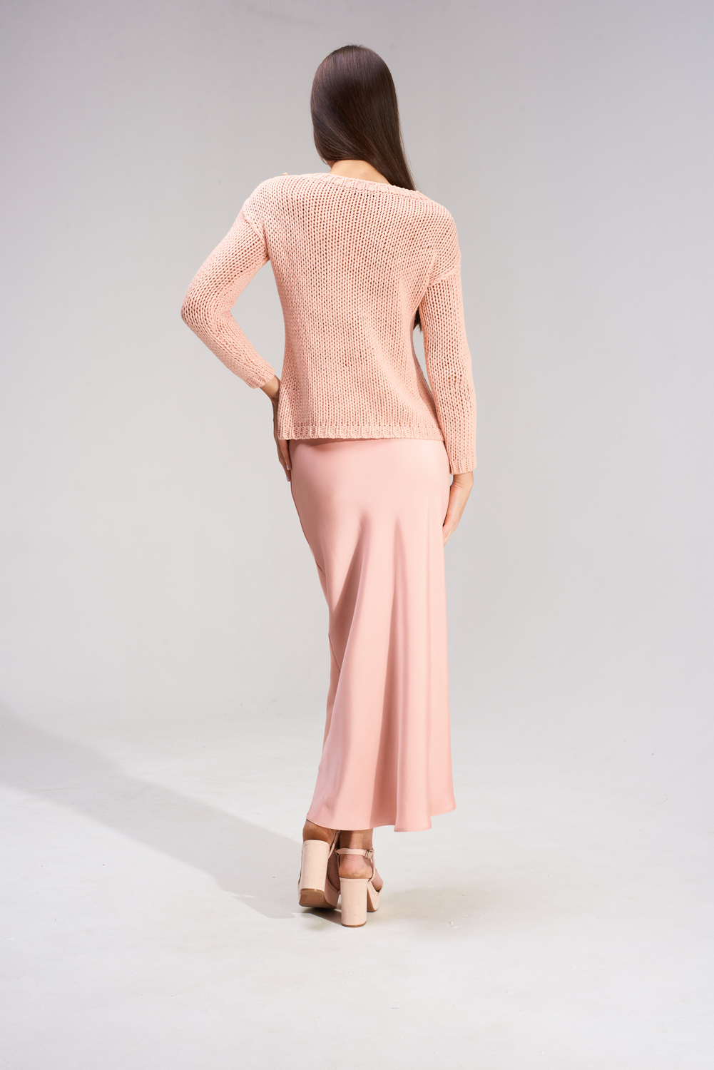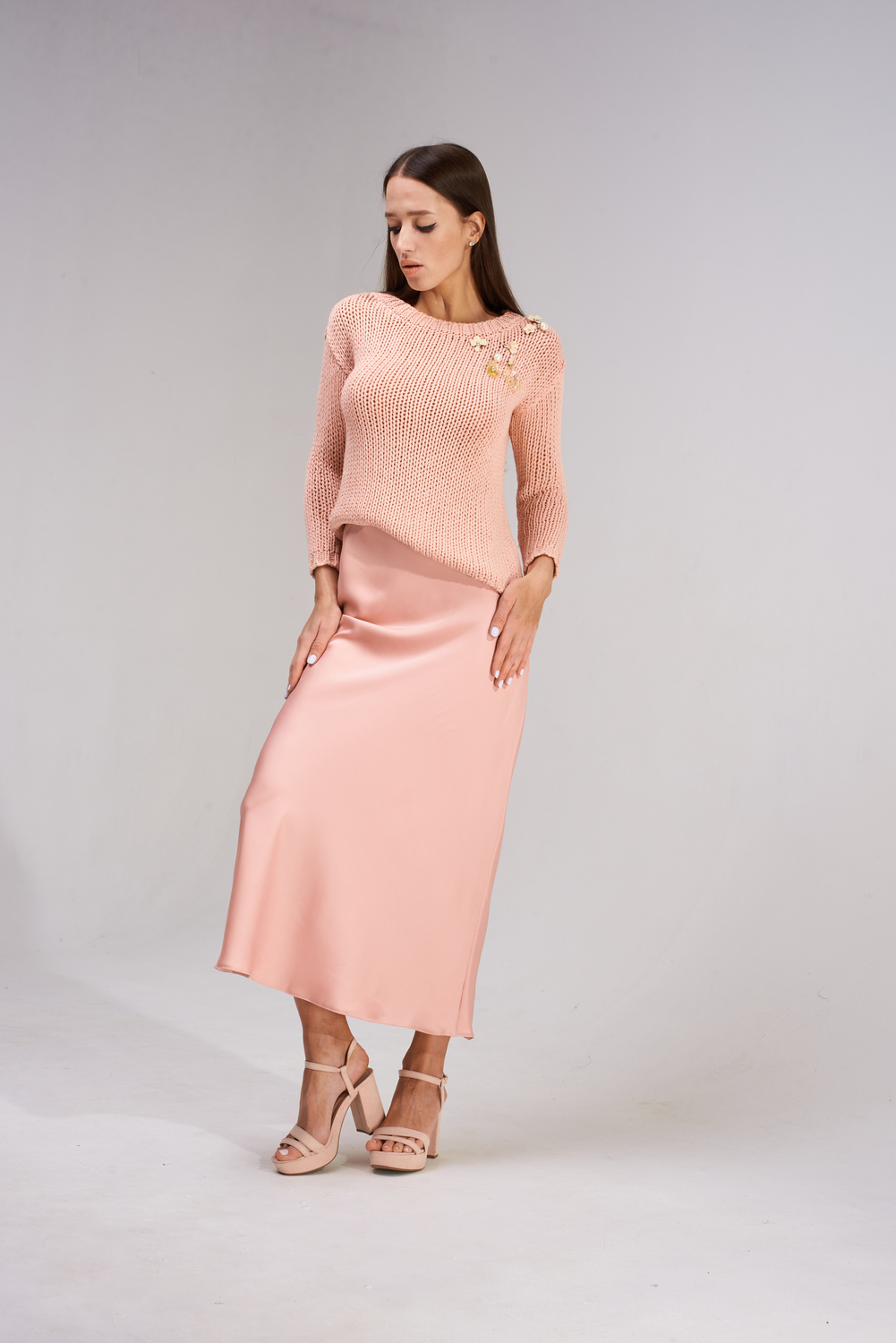 Юбка макси выполнена из шелка в нежно-розовом цвете. Такая модель подчеркивает изгиб бедер и ниспадает вниз красивой волной. Эта элегантная модель станет спутницей топа в бельевом стиле или трикотажного свитера свободной посадки, которые в паре создадут романтическое настроение образа.