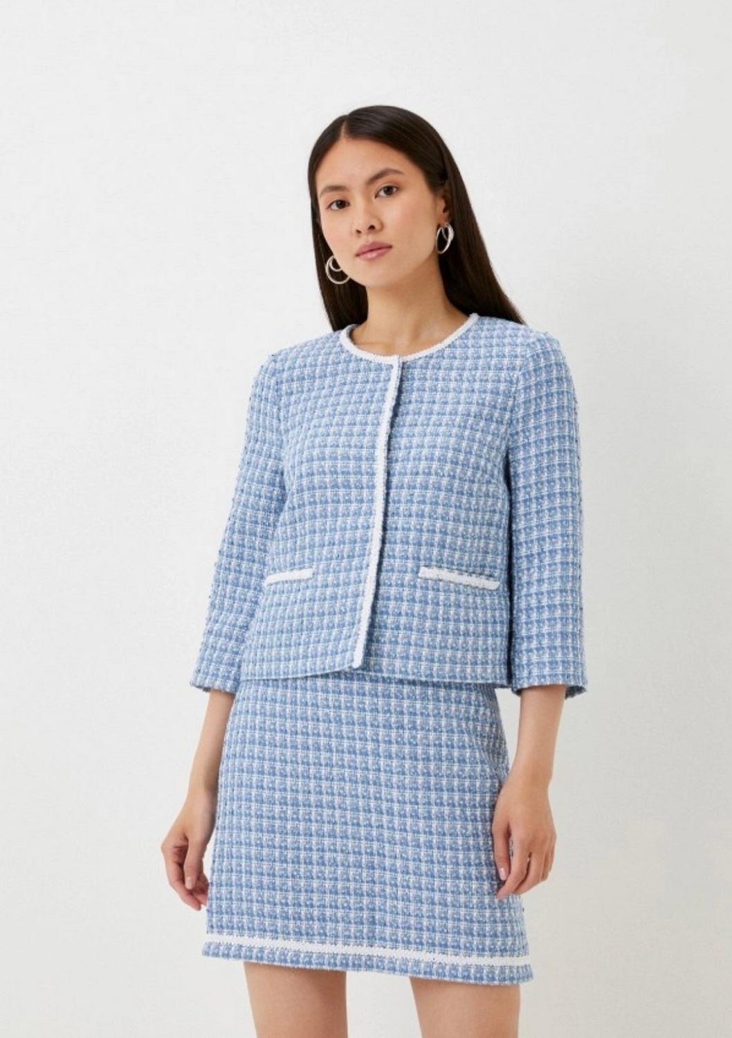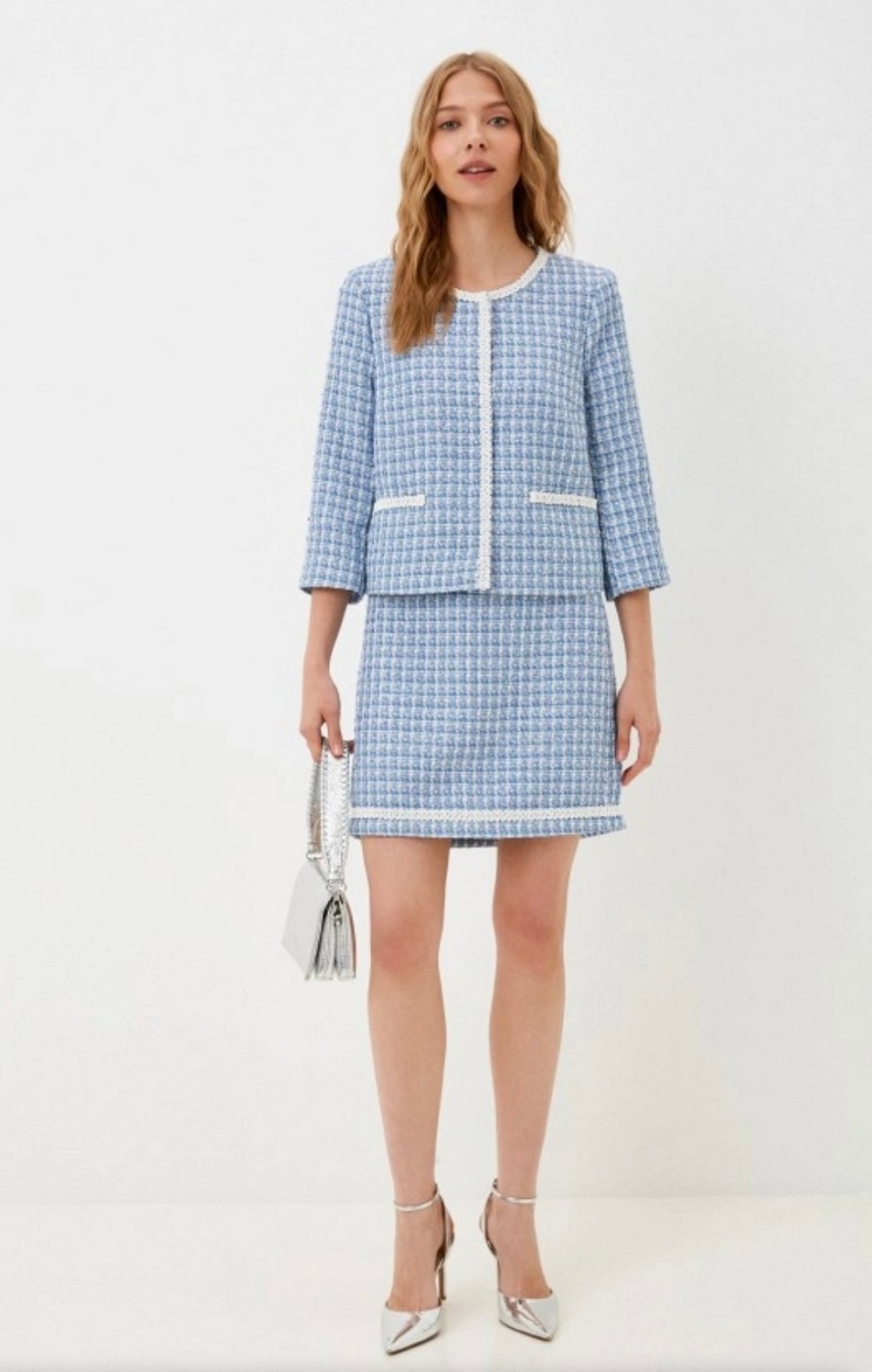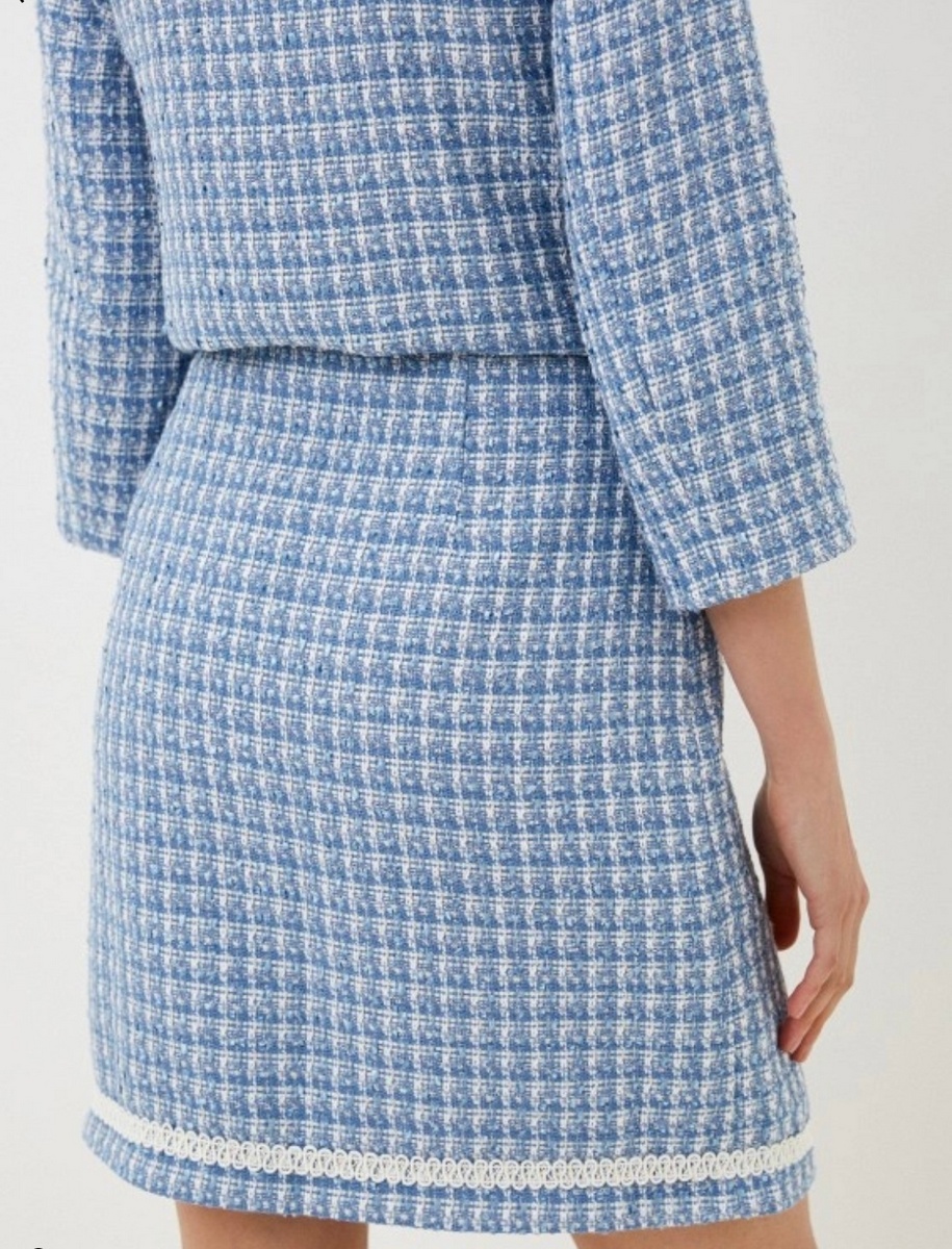 Юбка прямого силуэта из смешанного хлопкового твида-шанель в бело-голубую клетку, низ юбки украшен декоративной тесьмой нежного оттенка.