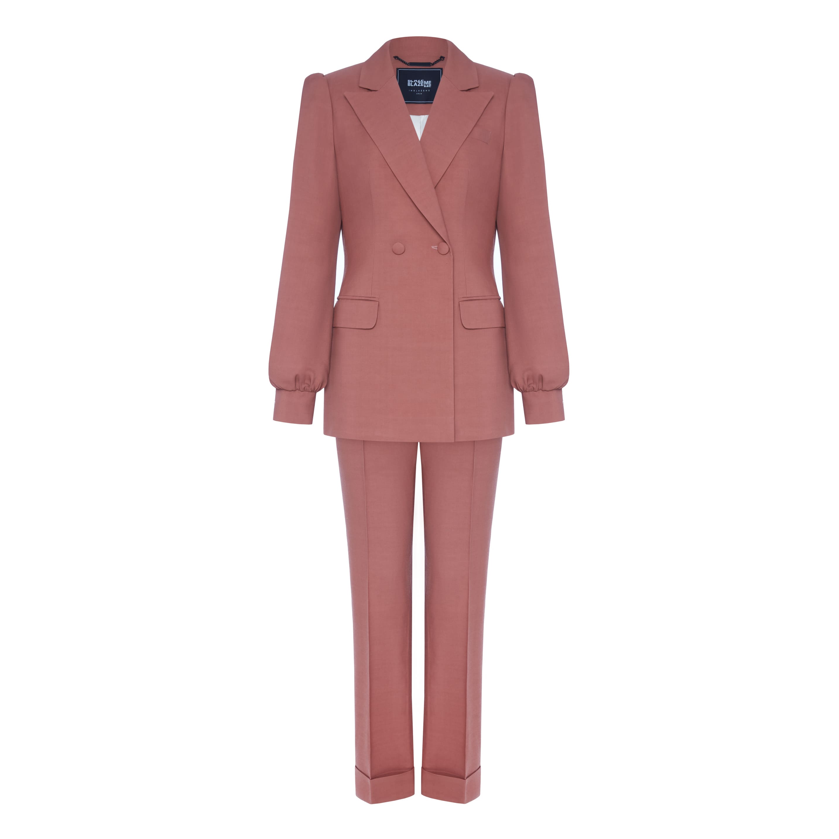Костюм в терракотовом цвете. Двубортный жакет приталенного силуэта с объемными рукавами и шлицей сзади. Прямые брюки с низкой посадкой, подворотами и стрелками.