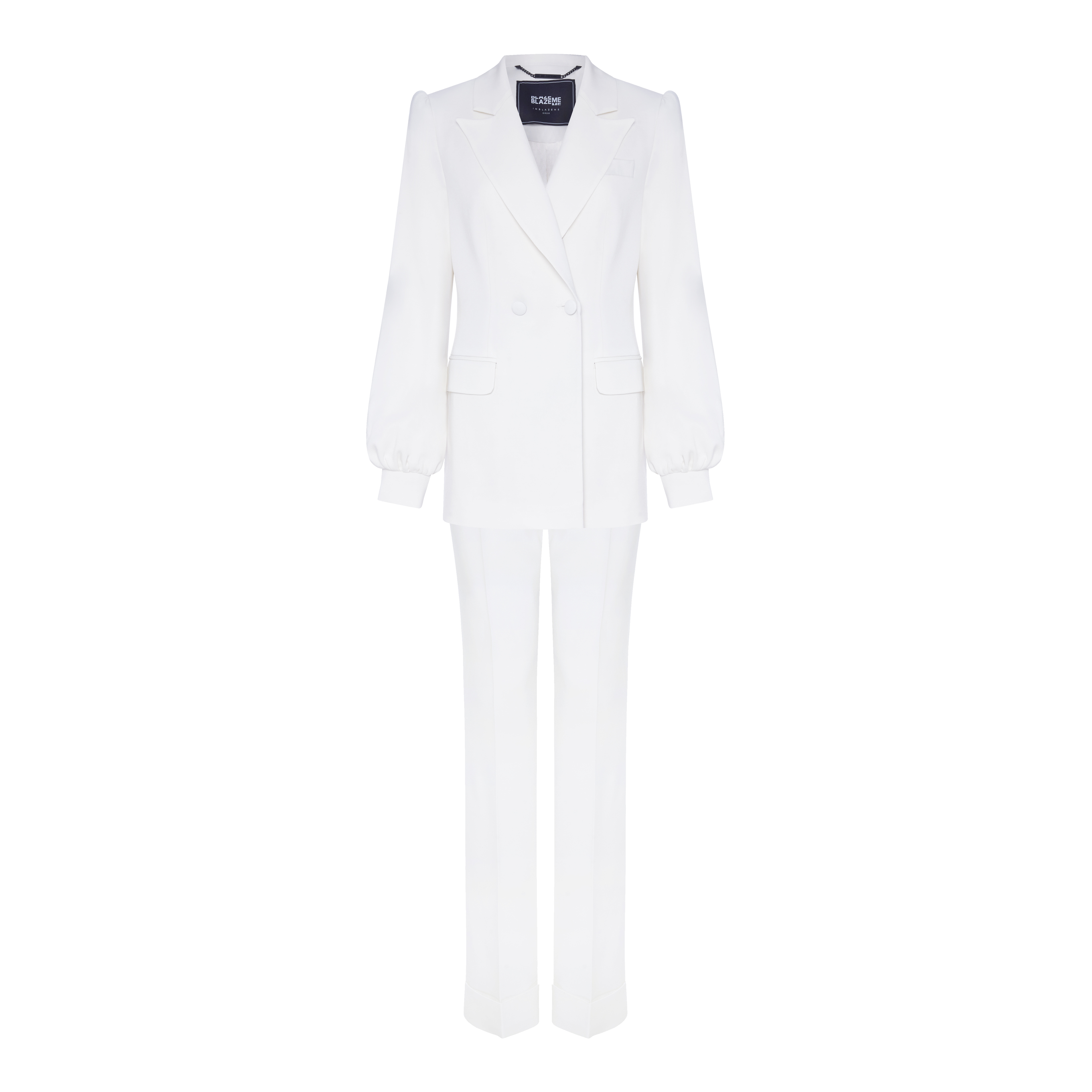 Костюм в белом цвете. Двубортный жакет приталенного силуэта с объемными рукавами и шлицей сзади. Прямые брюки с низкой посадкой, подворотами и стрелками.
