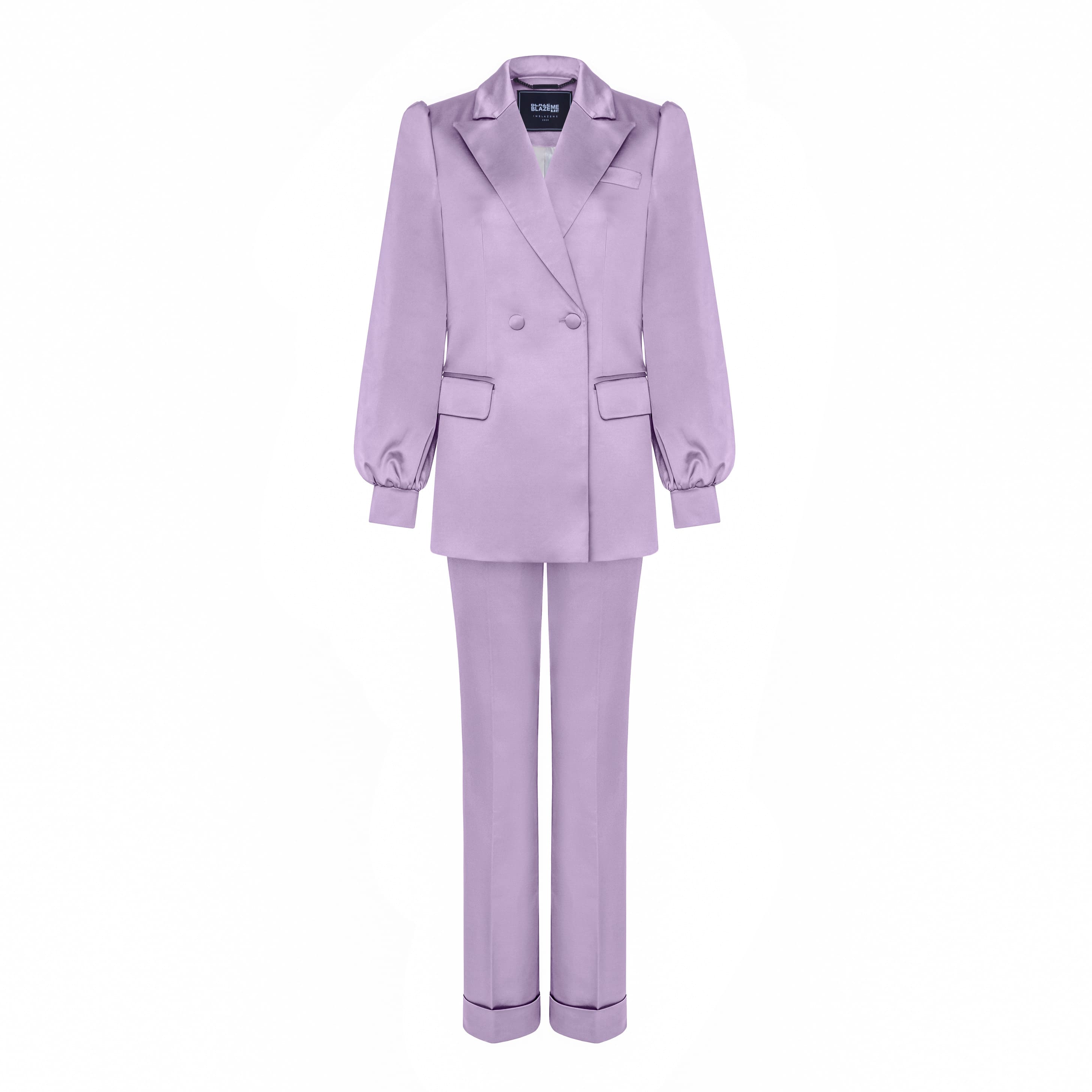Костюм из плотного, формодержащего, атласа в цвете чайная роза. Двубортный жакет приталенного силуэта с объемными рукавами и шлицей сзади. Прямые брюки с низкой посадкой, подворотами и стрелками.