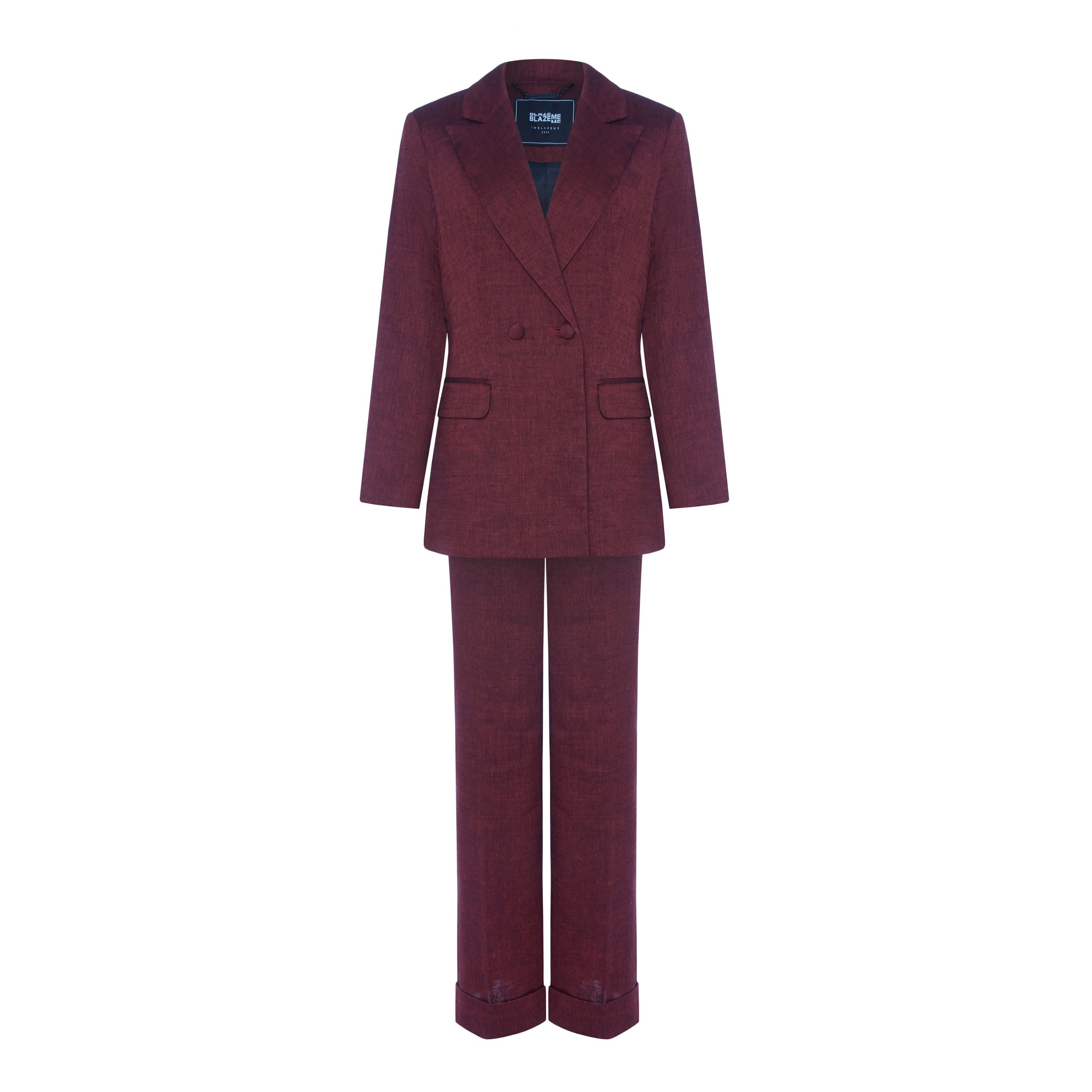 Костюм из мериноса с добавлением льна . Двубортный жакет приталенного силуэта с шлицей сзади. Прямые брюки с подворотами и стрелками, по бокам карманы , застежка на молнии с крючком.