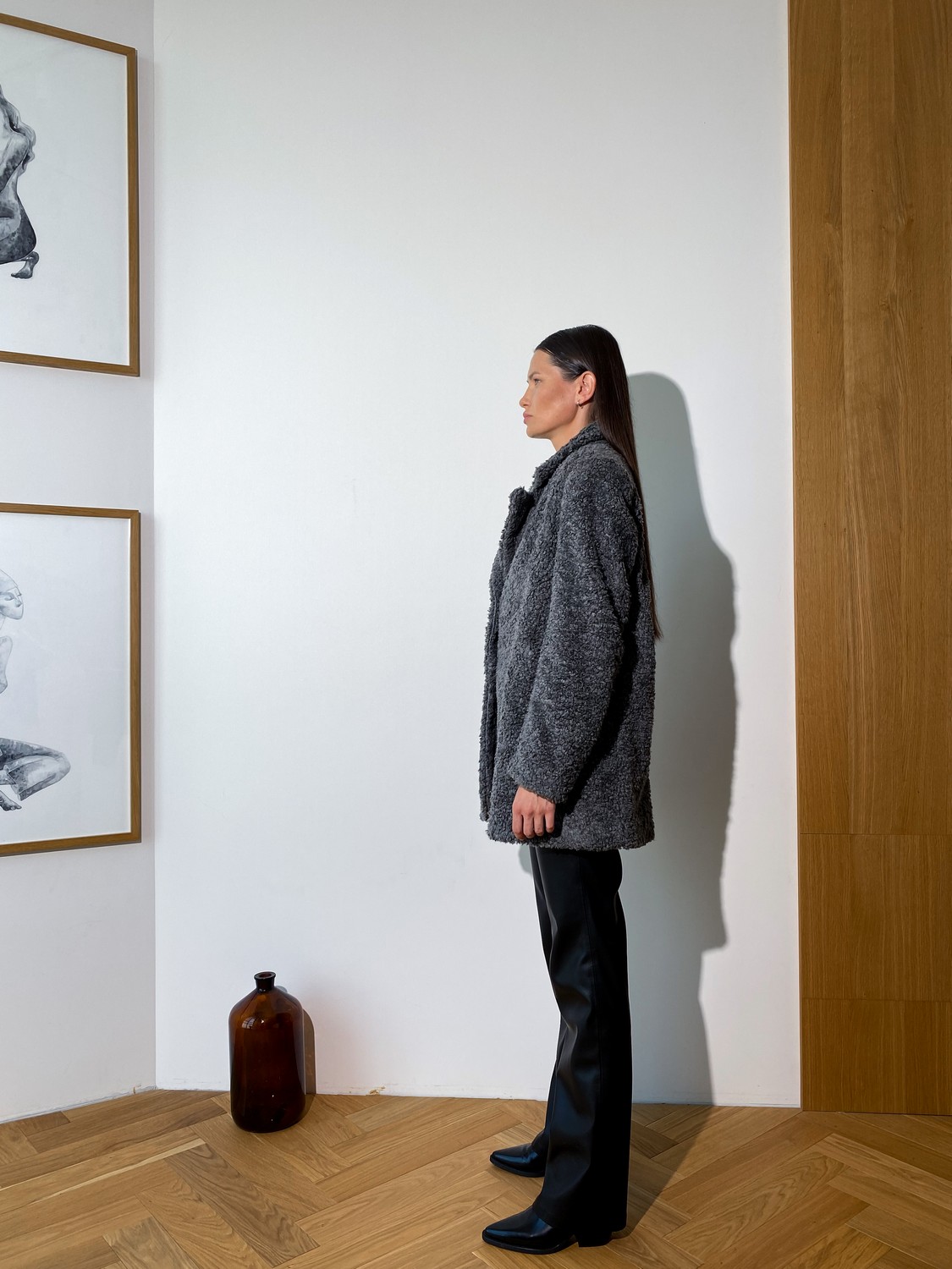 Модель прямого кроя с воротником, глубокими прорезными карманами и металлическими кнопками премиального качества.