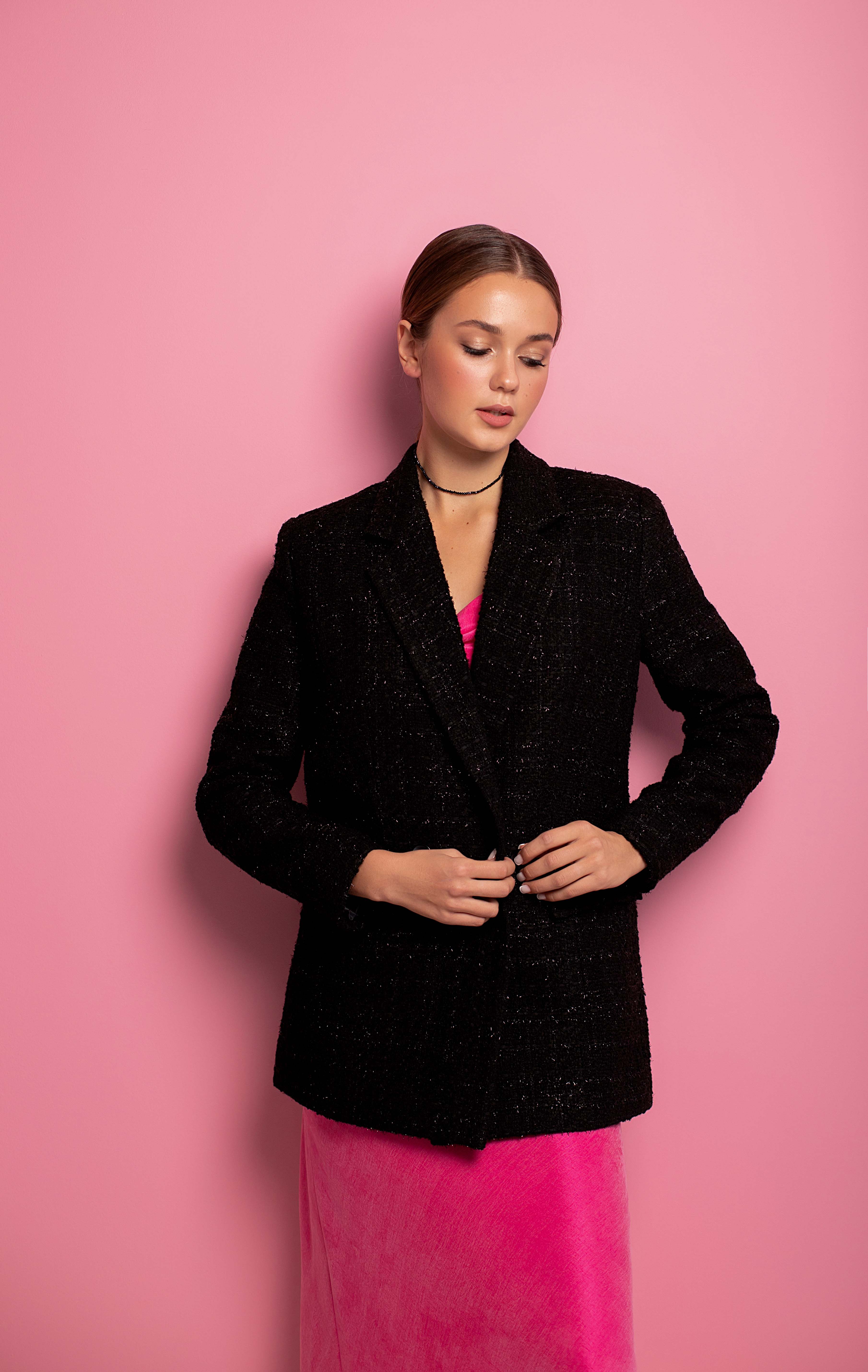 Прямой двубортный жакет с накладными карманами и застежкой на пуговицы. Внутренняя пуговица фиксирует подборт. Жакет выполнен из твида. Это фактурная, мягкая и плотная ткань с вплетением поблескивающей люрексной нити. Подкладка из 100% итальянской вискозы. Можно дополнить жакетом образ с платьем-комбинацией.