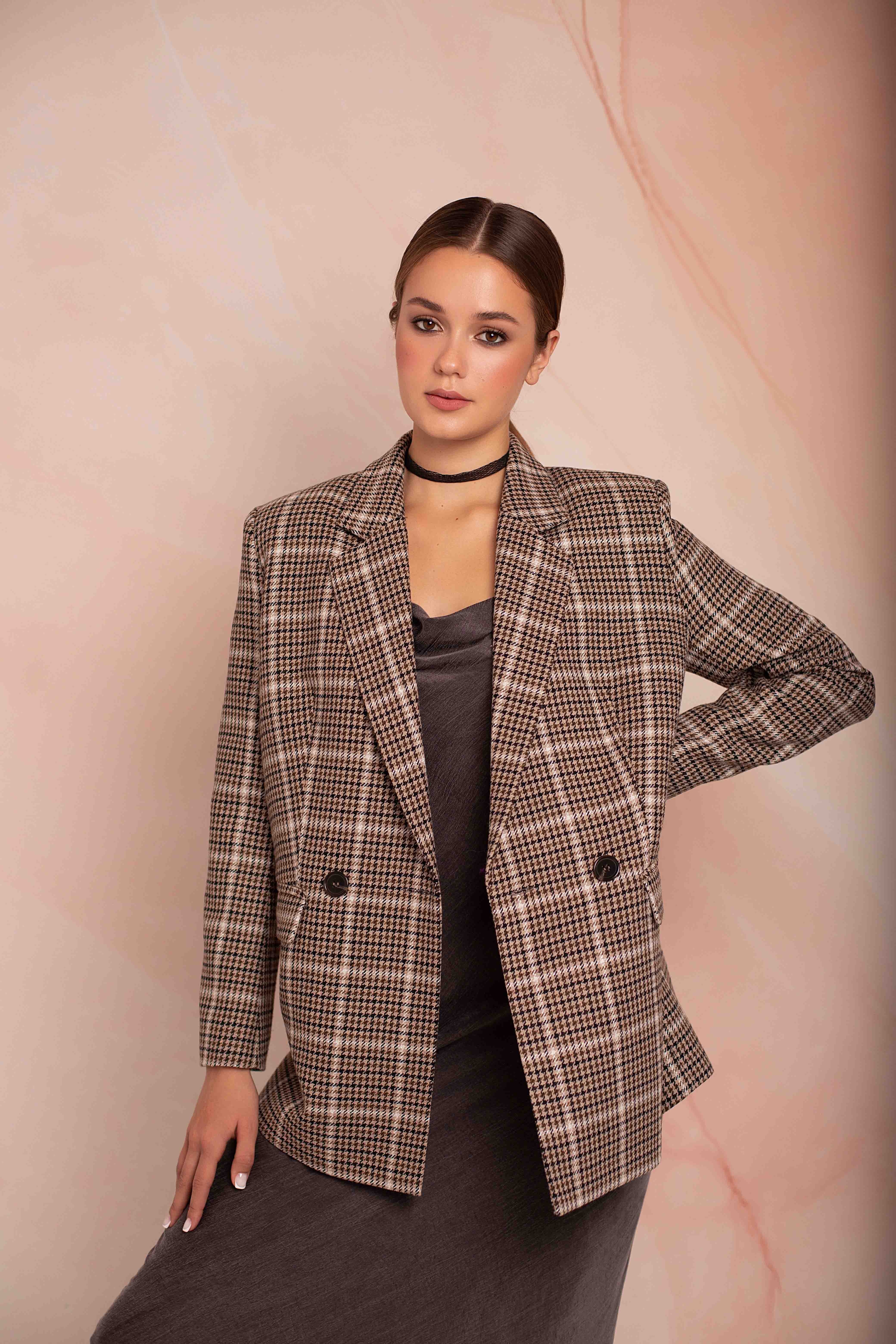 Двубортный жакет с элементами мужского пиджака — теплый и не слишком объемный, чтобы при необходимости вы могли надеть его под пальто. - Прямой силуэт, свободный в плечах - Застежка на пуговицы - Согревающая мягкая шерсть с узором «Гусиная лапка» и люрексной нитью. Искусственные волокна делают материал легче и долговечнее - На подкладке из 100% итальянской вискозы Можно дополнить жакетом образ с платьем-комбинацией.