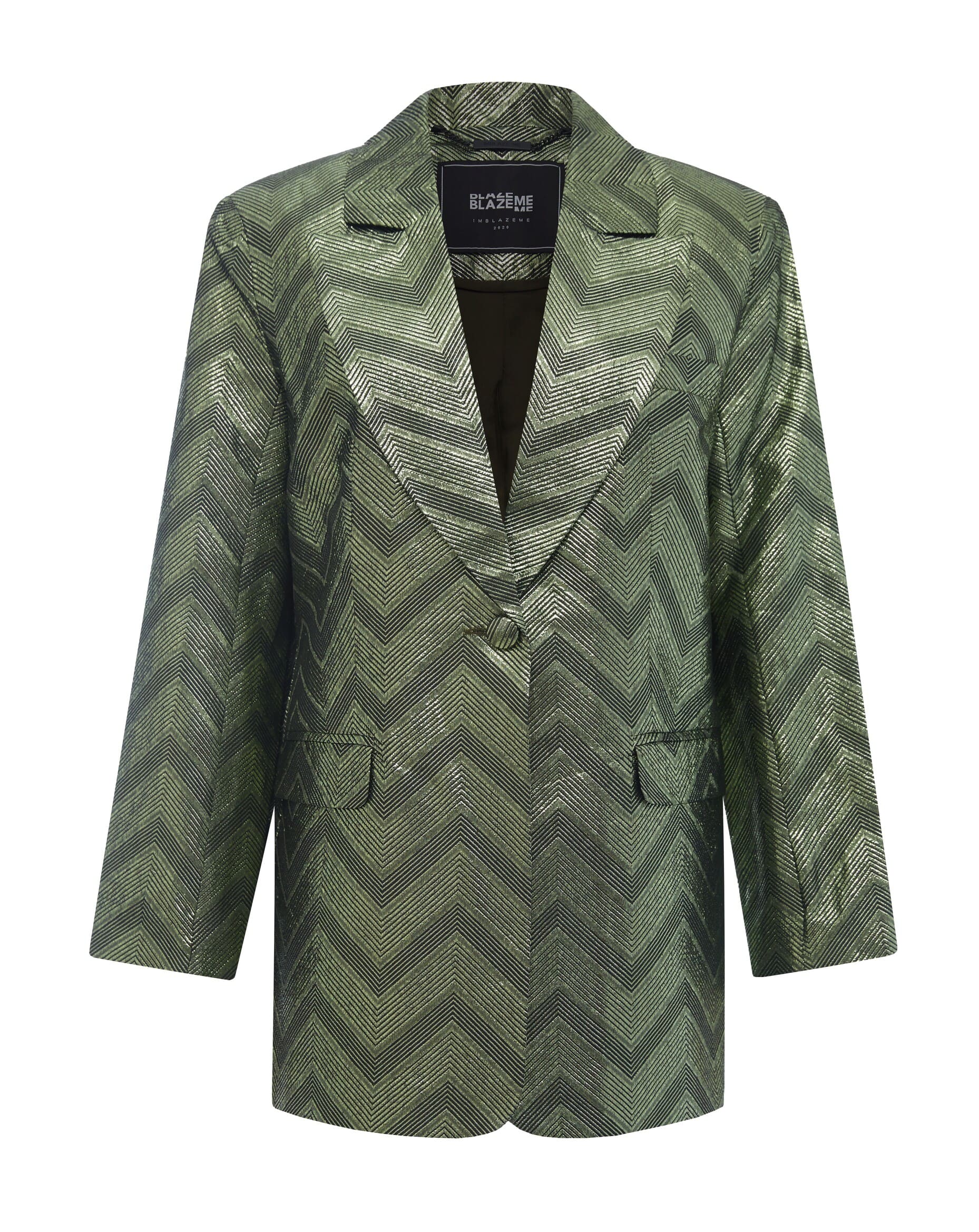 На волне ностальгии 1970-х однобортный жакет словно взят из мужского гардероба. Он имеет прямой крой, чётко очерченные плечи, одну шлицу, боковые карманы. Благодаря диагональному переплетению нитей, цвет жакета меняется в зависимости от освещения, от насыщенного зелёного до серебристо-чёрного с проблесками глубокого синего.