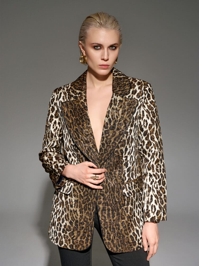 Прямой крой, заострённый отложной воротник, кожаный кант по лацкану, боковые карманы, шлица сзади.