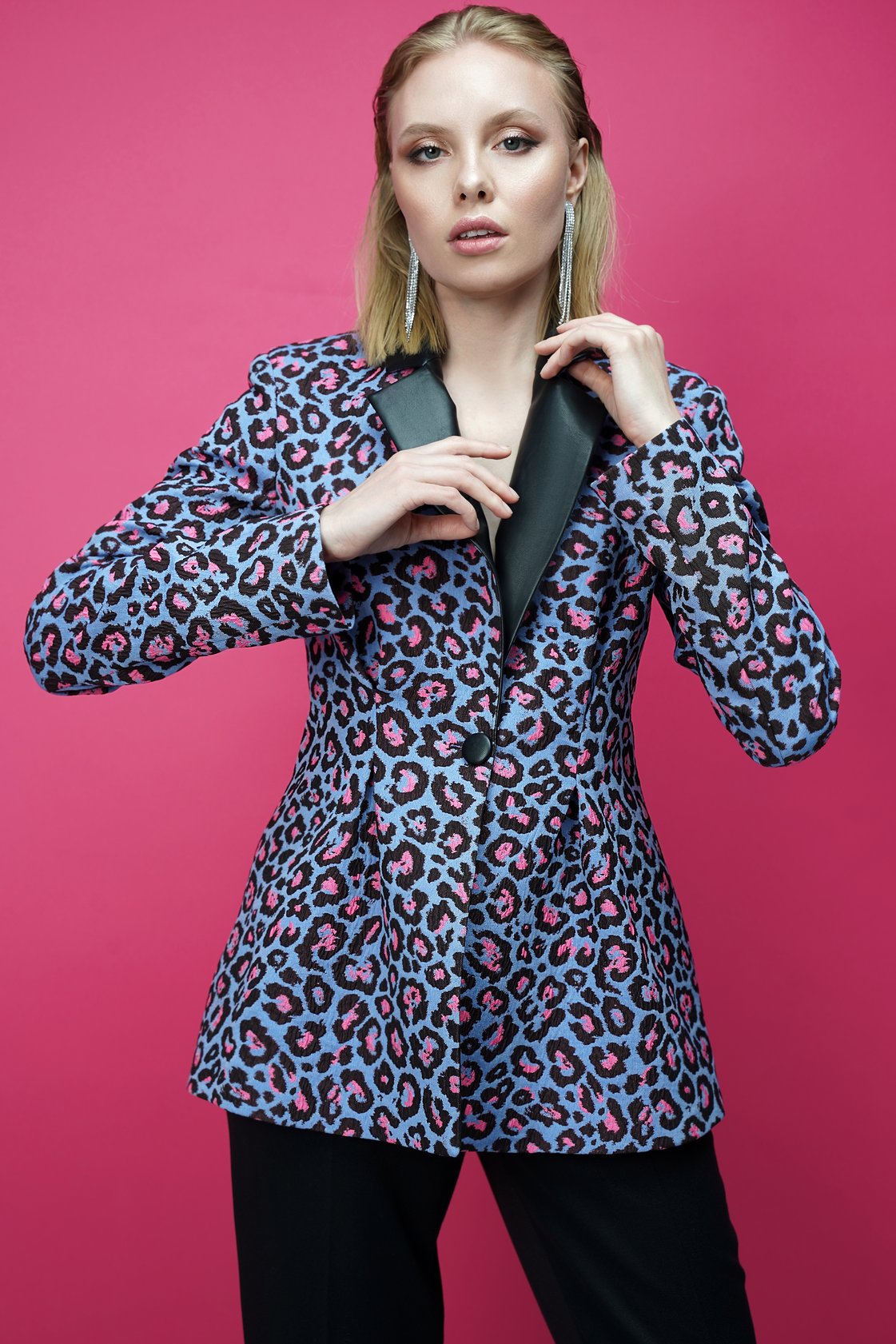 Жакет с защипами подчеркивающий талию, лацканы и пуговица из черной эко-кожи, подкладка шелк цвета фуксия